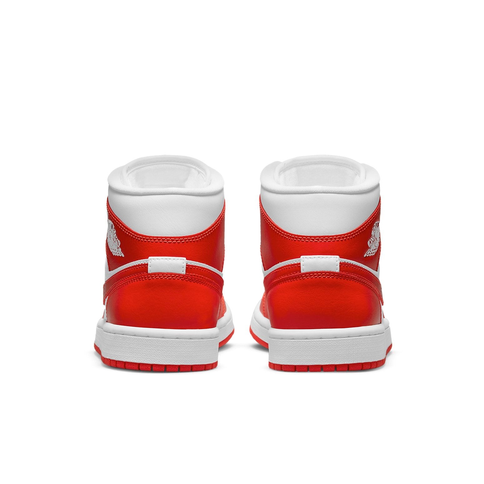 The women’s Air Jordan 1 Mid Syracuse (W) features a White/White/Habanero Red colorway, with the Habanero Red appearing orange, much like the school color of the University of Syracuse. The upper of the sneaker is white leather with perforations in the toebox. The leather overlays and Swoosh are orange. The outsole is orange with a concentric-circles pattern in the rubber. The midsole and laces are white. An orange Jumpman logo appears on the white tongue, and a white Wings logo is on the orange collar. There is visible stitching throughout the shoe. This women s shoe, the Air Jordan 1 Mid Syracuse (W), was released on August 26, 2021, at a retail price of $120.