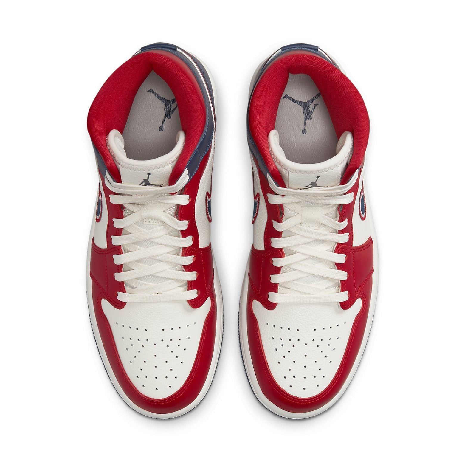 Available in women s sizing, the Jordan 1 Mid USA 2022 (W) is a mid-cut version of the Air Jordan 1 released to celebrate 2022 American Independence Day.Dressed in Gym Red/Light Iron Ore/Sail/Midnight Navy, the upper is constructed with a mix of smooth and tumbled leather. This sneaker features a Sail base on the toe box and mid-panel accented by Gym Red overlays on the forefoot, ankle collar, and eyestay. Midnight Navy on the heel and collar flaps complete the American flag theme. Other details include a stitched denim Swoosh with an exposed Gym Red outline, toe box perforations, the trademark Wings branding on the right collar flap, Sail laces, and tongue branding. A white midsole and Midnight Navy rubber outsole complete the design.Our experts love this sneaker s colorway. The American flag-inspired colorway makes this sneaker a great choice for celebrating patriotic holidays. The Jordan 1 Mid USA 2022 (W) was made available on March 22nd, 2022. Initially, it retailed at $135.