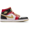 The Jordan 1 Mid XQ White Black Sport Red is the wider launch of the sneaker that originally debuted in limited release in China in 2007 to celebrate the opening of Nike stores in major Chinese cities. The Jordan 1 Mid-Top Xing Qi “Happy Occasion” is an eye-catching sneaker in white, black, and red with hits of gold. The upper base is white leather that features perforations on the toebox and decorative red stitching on the quarter panel. The collar is red leather, as are the eyestay overlays. Black leather forms the overlays on the toe, heel, and collar. The side-panel Nike Swoosh is gold leather that matches the laces, sock liner, branded insole, Jumpman on the tongue, and the Air Jordan Wings logo on the lateral collar. The white foam midsole and gold rubber outsole complete the celebratory look of this shoe. The detail that our experts appreciate the most about this sneaker is the debossed pattern of stars on the midfoot overlay that emphasizes one of the signature Air Jordan design elements. The Jordan 1 Mid XQ White Black Sport Red debuted on January 15, 2022, for $135 retail.