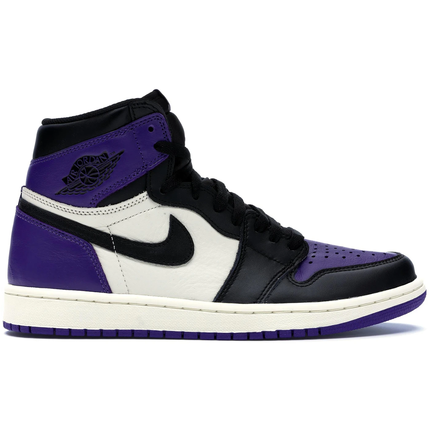 What screams both royalty and NBA s rookie of year in 1985? The Air Jordan 1 Retro High Court Purple. Showcasing a magical splash of color, these shoes have a leather upper in black, sail, and court purple.