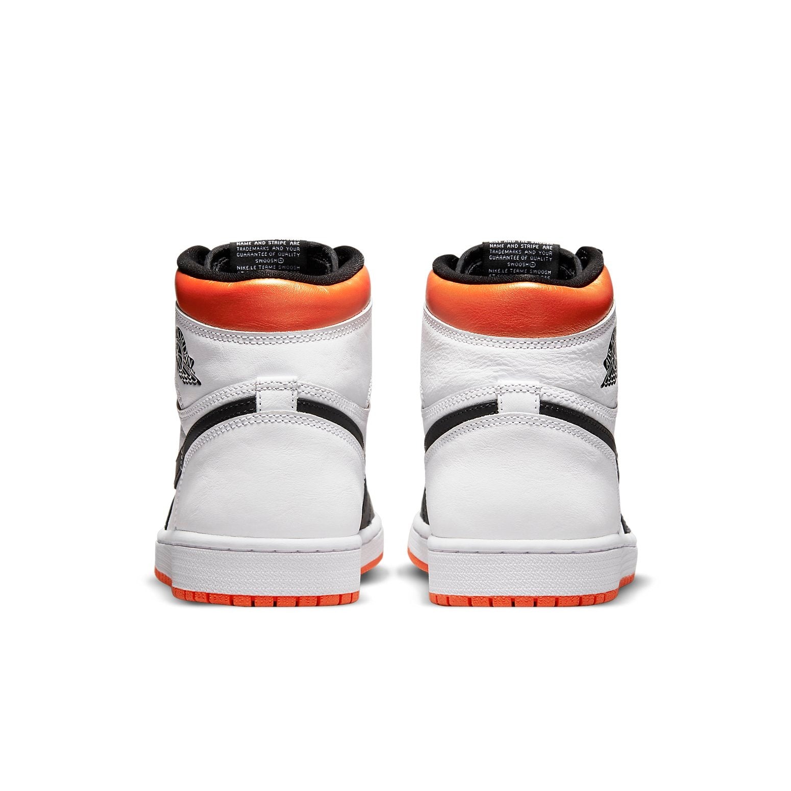 The Air Jordan 1 High Electro Orange features a white leather upper with black overlays and a Hyper Orange ankle wrap. From there, a matching woven tongue label and sole complete the design.The Air Jordan 1 High Electro Orange released in July of 2021 and retailed for $170.