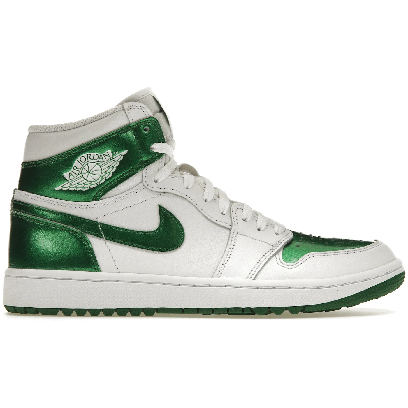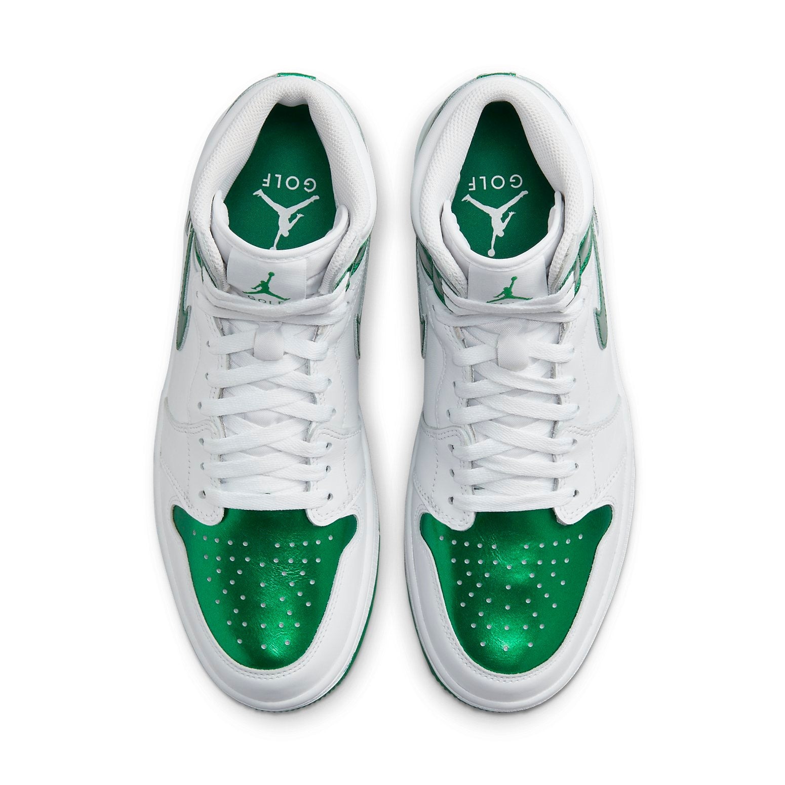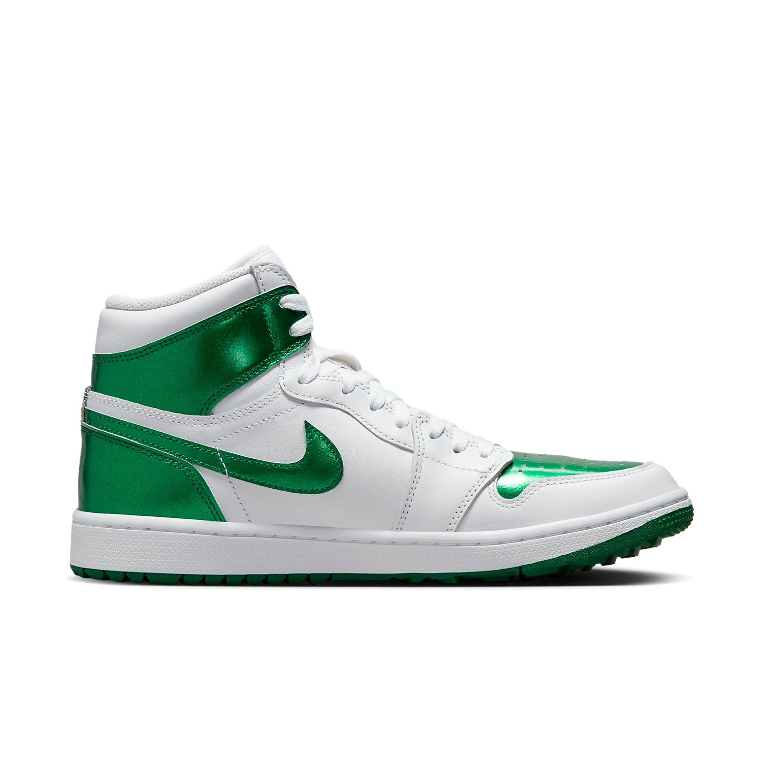 The Jordan 1 Retro High Golf Metallic Green takes an iconic basketball silhouette, reimagines it for golf, and dresses it in an eye-catching iridescent colorway. The Metallic Green Air Jordan 1 Retro High-Top Golf shoe features a vintage upper with a base of white leather. White leather overlays adorn the midfoot and eyestays. Flat white laces crisscross over a white tongue and match the padded white sock liner that offers enhanced ankle comfort. Iridescent green leather adds a sheen to this upper with a perforated toe box underlay, heel and collar overlays, and the side panel Nike Swoosh. A white Wings logo is stamped on the lateral collar overlay, a green Jumpman adorns the white tongue tag, and a white Jumpman graces the green insole to complete the look of this upper. Our favorite aspect of this sneaker is the outsole, which has been modified for golf. Beneath a white foam midsole, a green rubber outsole sports sharpened lugs to provide grip on the fairway. The Jordan 1 Retro High Golf Metallic Green was released on April 28, 2023, for $180 retail.