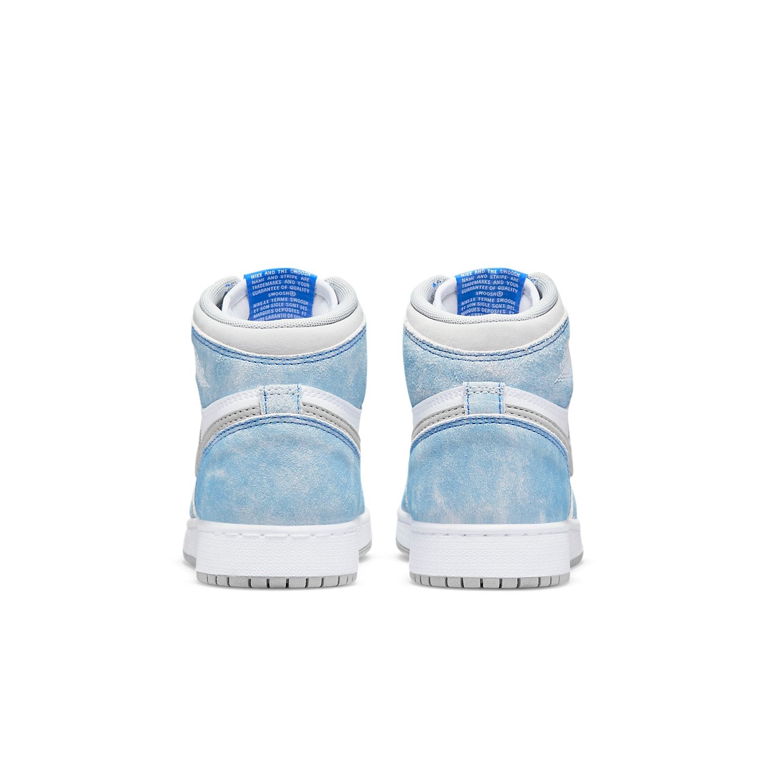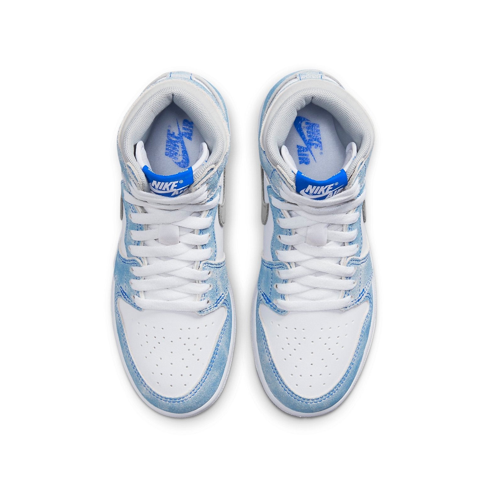 The children s (Grade-School sizing) Air Jordan 1 Retro High Hyper Royal Smoke Grey GS uses a Hyper Royal/Light Smoke Grey/White colorway. The white leather upper features a Light Smoke Grey Swoosh and gray leather collar accents. Blue distressed suede overlays give the shoe a vintage feel. The Nike Air logo and Swoosh appear on a blue patch on the white tongue, and also on the white insole. A white “Wings” icon enhances the suede on the collar. The midsole is white with an Air unit, and the outsole is gray.The Air Jordan 1 Retro High Hyper Royal Smoke Grey GS was released on April 17, 2021, and retailed for $130.