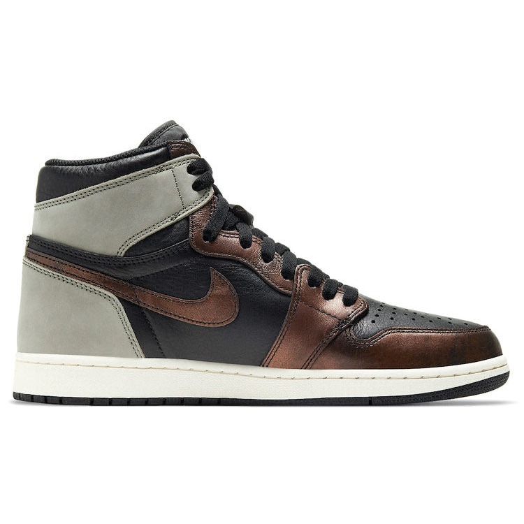 The Air Jordan 1 Patina features a black leather upper with Light Army suede and copper-finished leather overlays. A mint Nike Air logo patch is stitched atop a black nylon tongue, adding a hit of color to the otherwise earth tone colorway.The Air Jordan 1 Patina released in May of 2021 and retailed for $170.