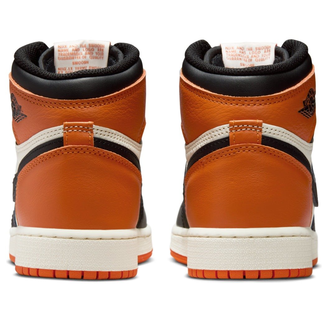 The Jordan 1 Retro High OG Shattered Backboard (2025) (GS) features a Black/Black-Sail-Starfish colorway. This Jordan 1 Retro High OG was first released for $140 on August 23, 2025.