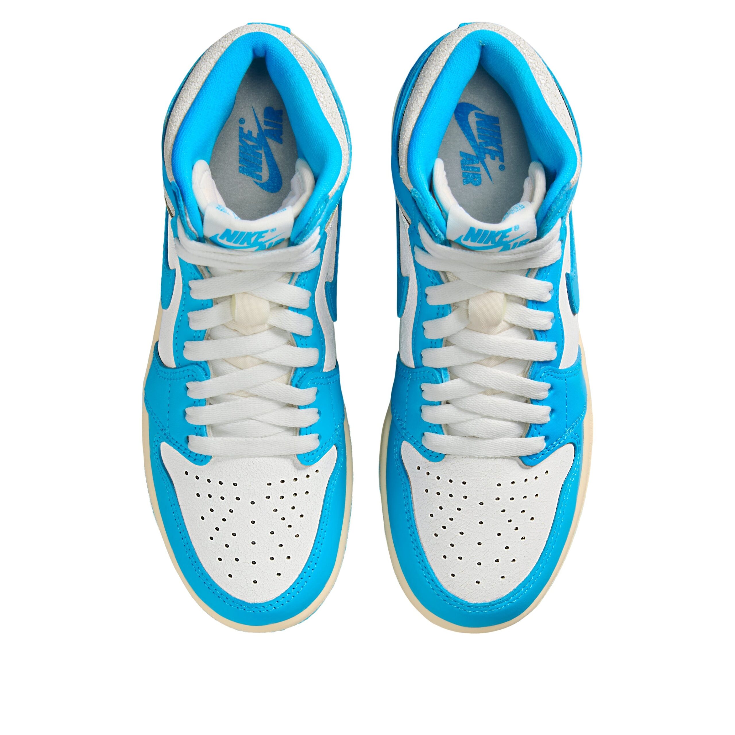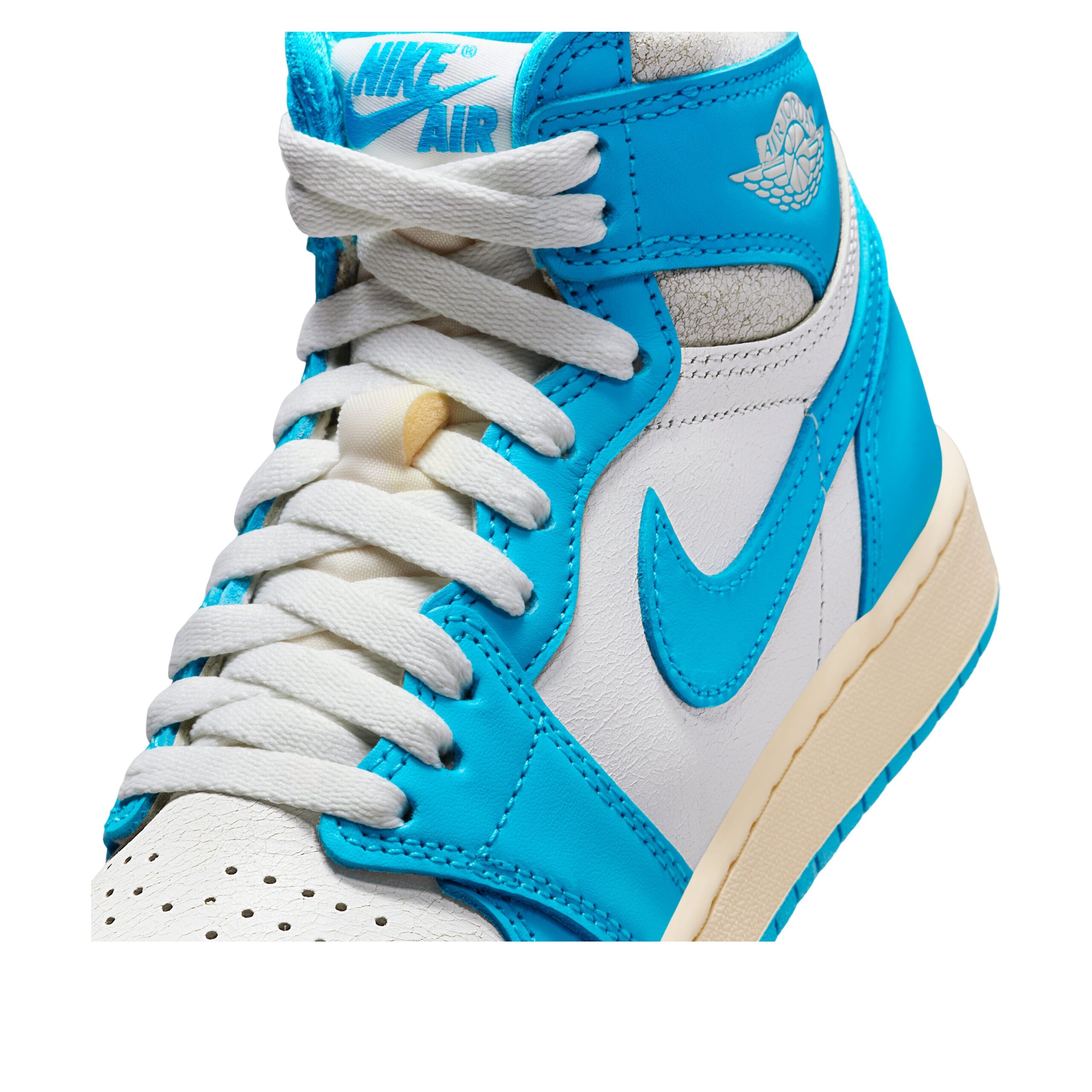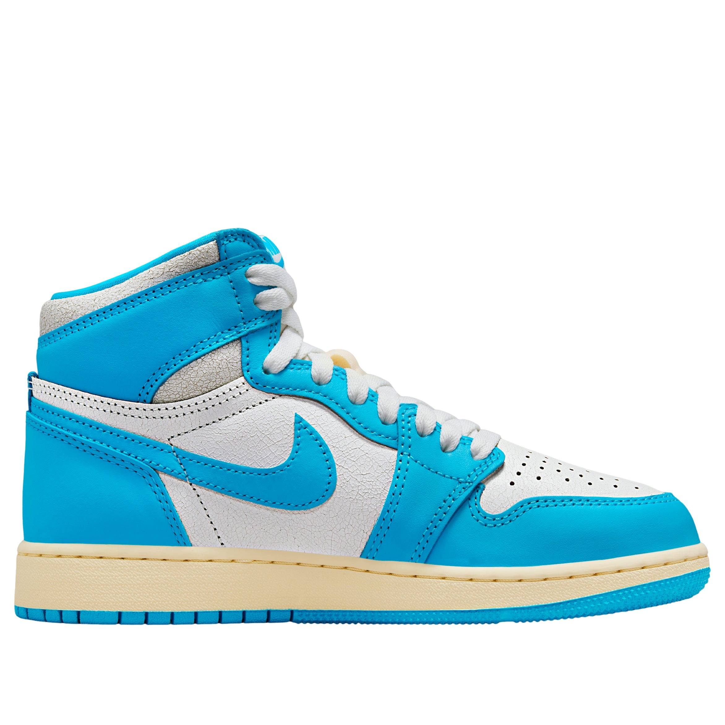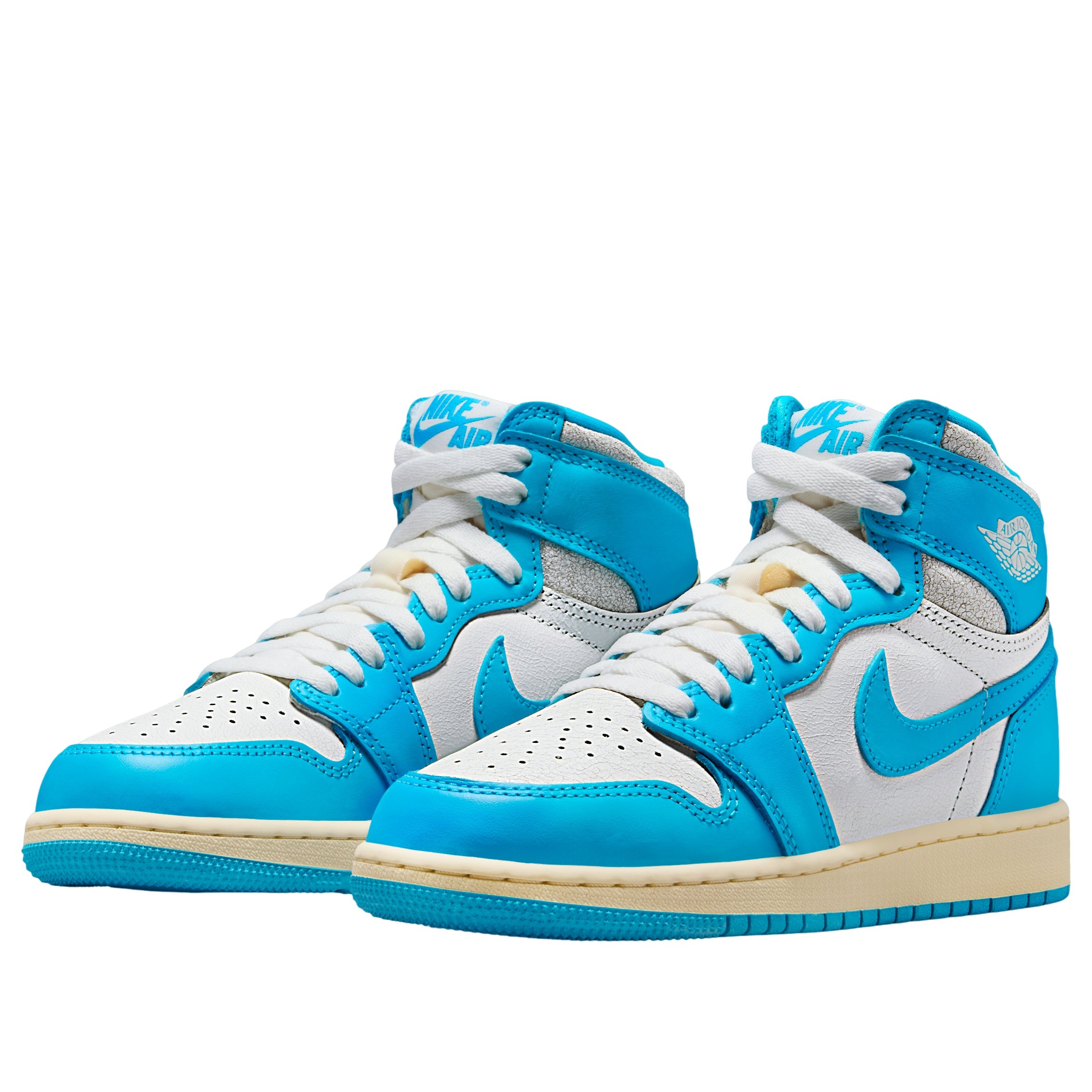 The Jordan 1 Retro High OG UNC Reimagined (GS) delivers a bold twist on a classic, dressed in a striking dark powder blue and sail colorway made exclusively for grade school sizes. Built from a mix of smooth and tumbled leather, the UNC Reimagined (GS) Jordan 1 Retro High OG offers a blend of durability, support, and standout style. A crisp white leather and dark powdered blue base, perforated toe box, and padded collar enhance comfort and breathability for everyday wear. Signature touches include the stamped white Wings logo on the ankle collar and dark powder blue Swooshes across the side panels. Subtle Nike branding hits the tongue tag, insole, and outsole, tying the look together. A cushioned midsole provides lightweight responsiveness, while the rubber outsole with a pivot-point tread pattern ensures reliable grip on a variety of surfaces. The Jordan 1 Retro High OG UNC Reimagined (GS) stands out for its clean design, premium materials, and understated color blocking. It was released on May 10, 2025, with a retail price of $140.