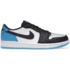 The Air Jordan 1 Retro Low OG UNC arrives with a white leather upper with contrasting black overlays and a University blue Swoosh. This sneaker comes in a combination of white, dark powder blue, and black hues.This Retro Low OG UNC model also features a black Wings Nike logo on its heel. Lastly, there is a black woven tongue and a blue outer sole that completes its design.The Air Jordan 1 Retro Low OG UNC was first released on 29th July 2022. At the time, this sneaker had a suggested retail price set at $130.