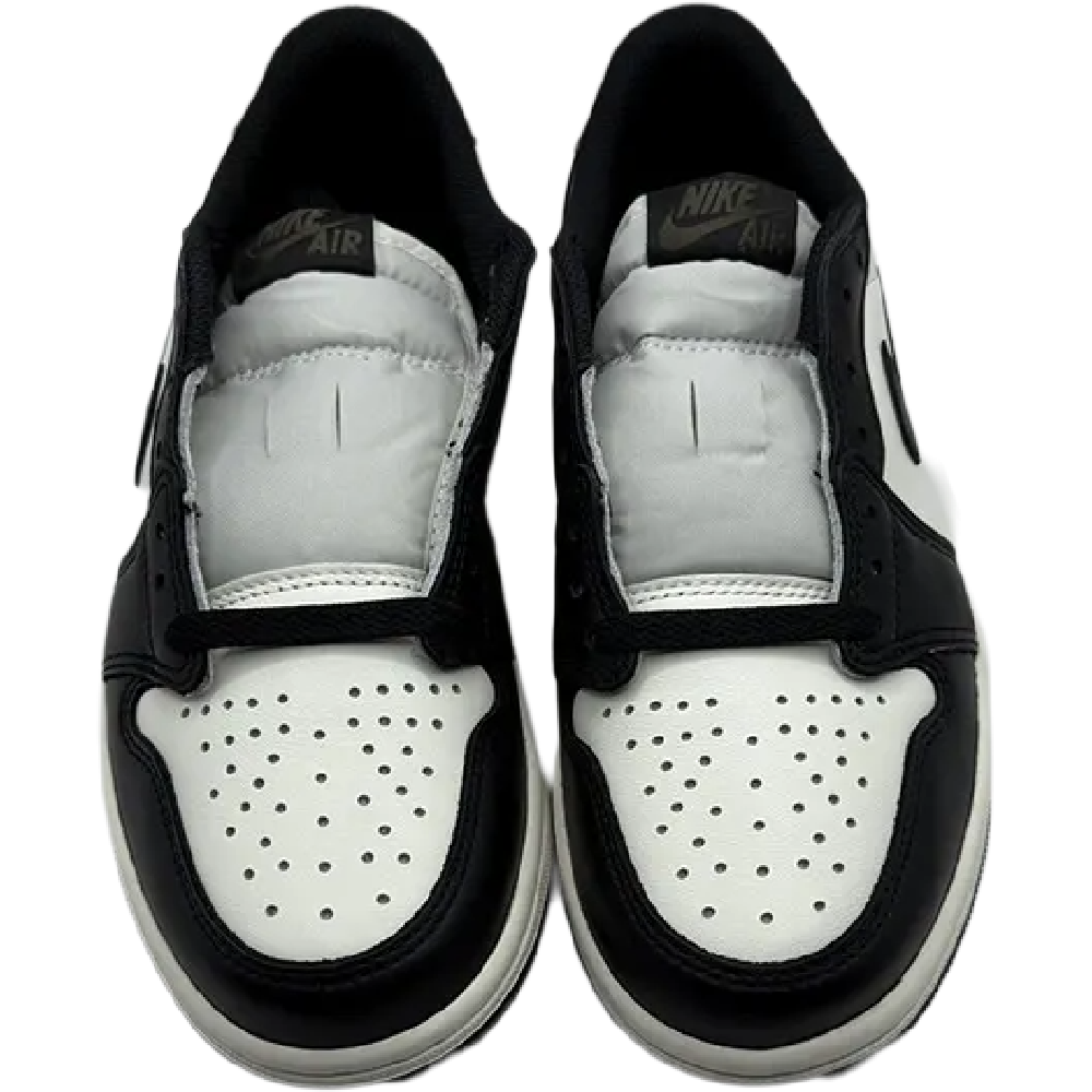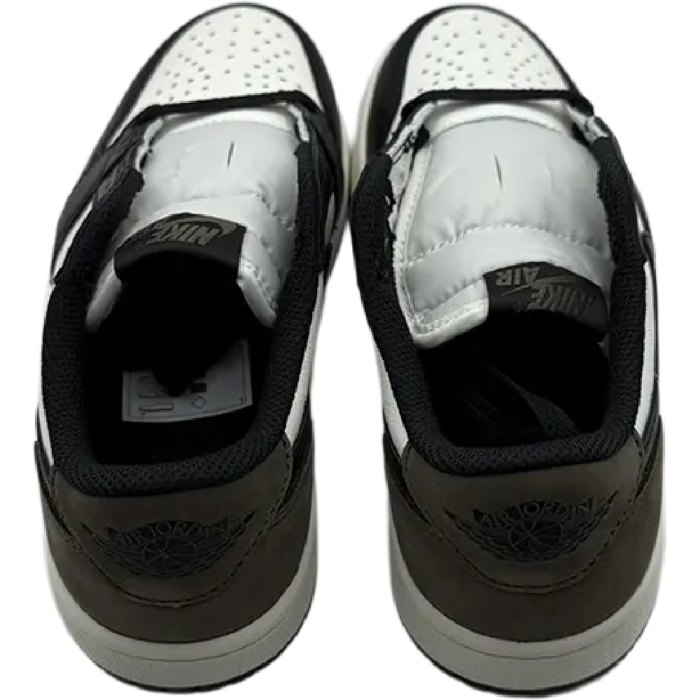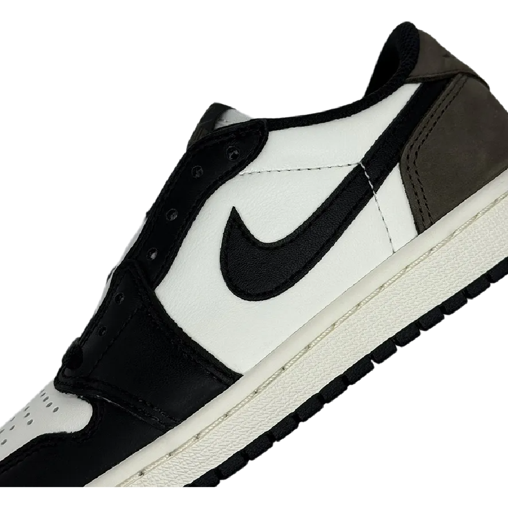 The upper of the Mocha Jordan 1 Retro Low OG is composed of white leather. The side panels and the toebox, which also features holes for additional airflow, are made of same material and color. The bottom eyelets are fastened to the midsole by a black leather overlay that also functions as the mudguard and toecap. On each side, there are also thin black Nike Swooshes made of black leather. The heel collar and heel counter are made of Dark Mocha suede, and the heel collar has the black Air Jordan emblem. The tongue also has a Dark Mocha Nike Air patch. The design is finished with a black outsole and white midsole.