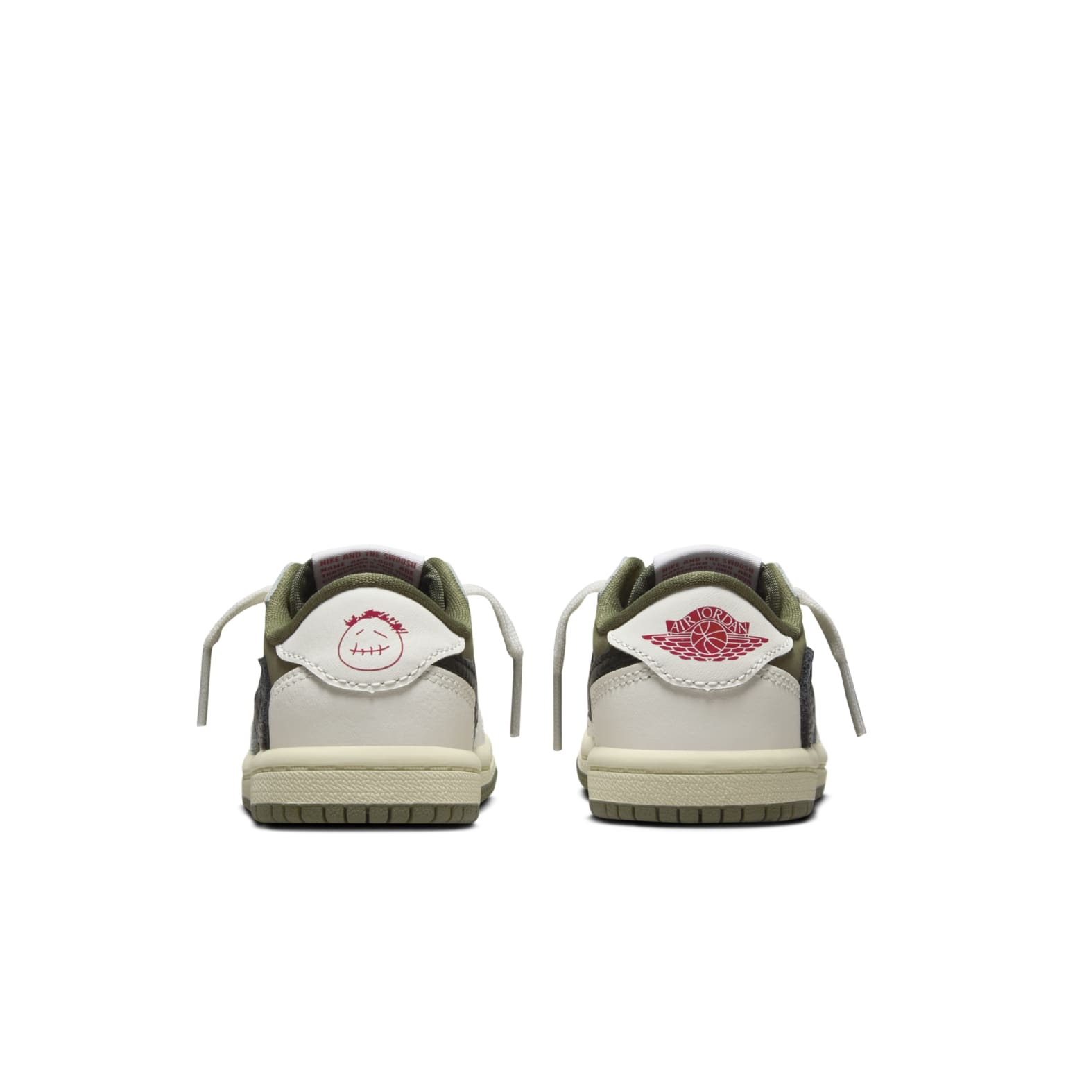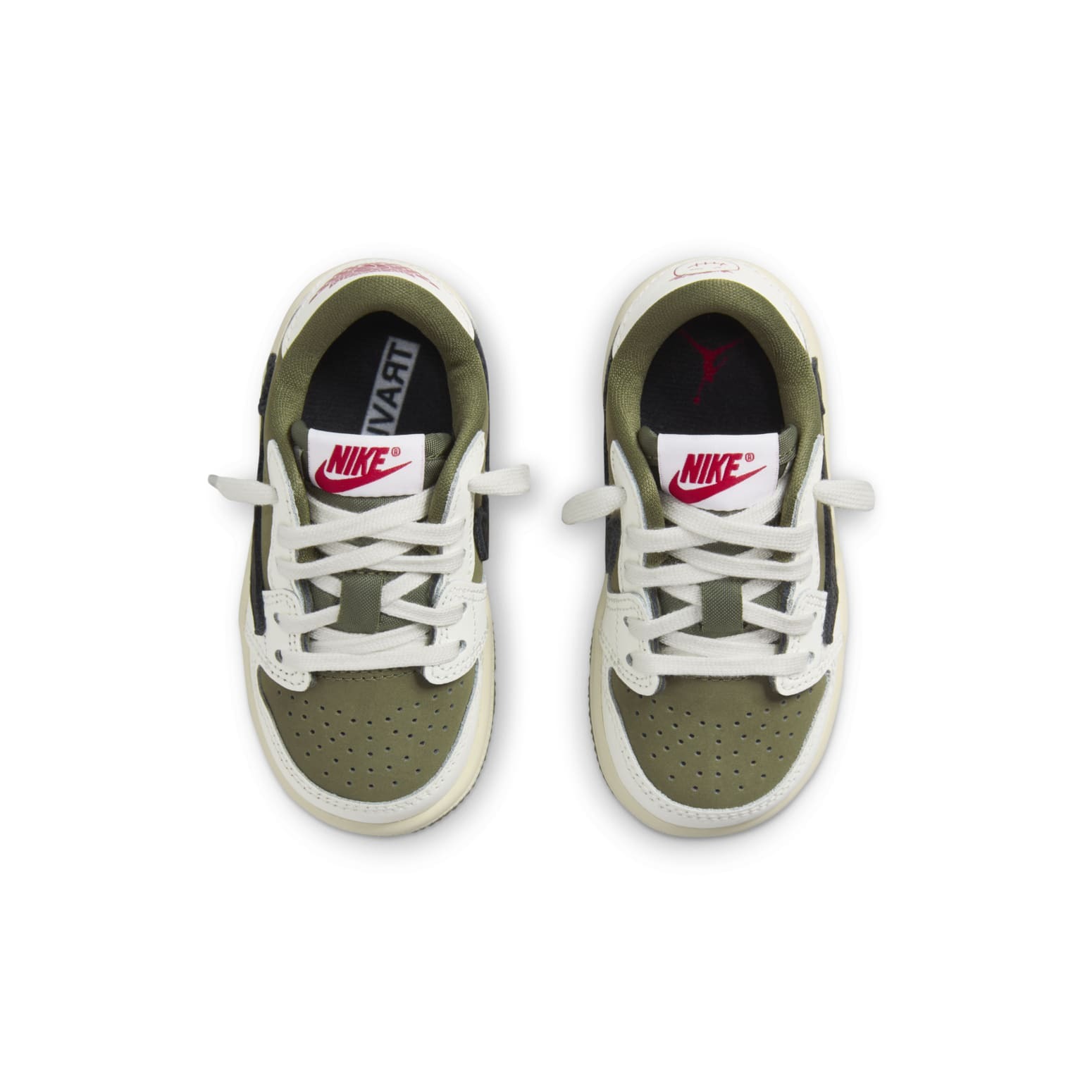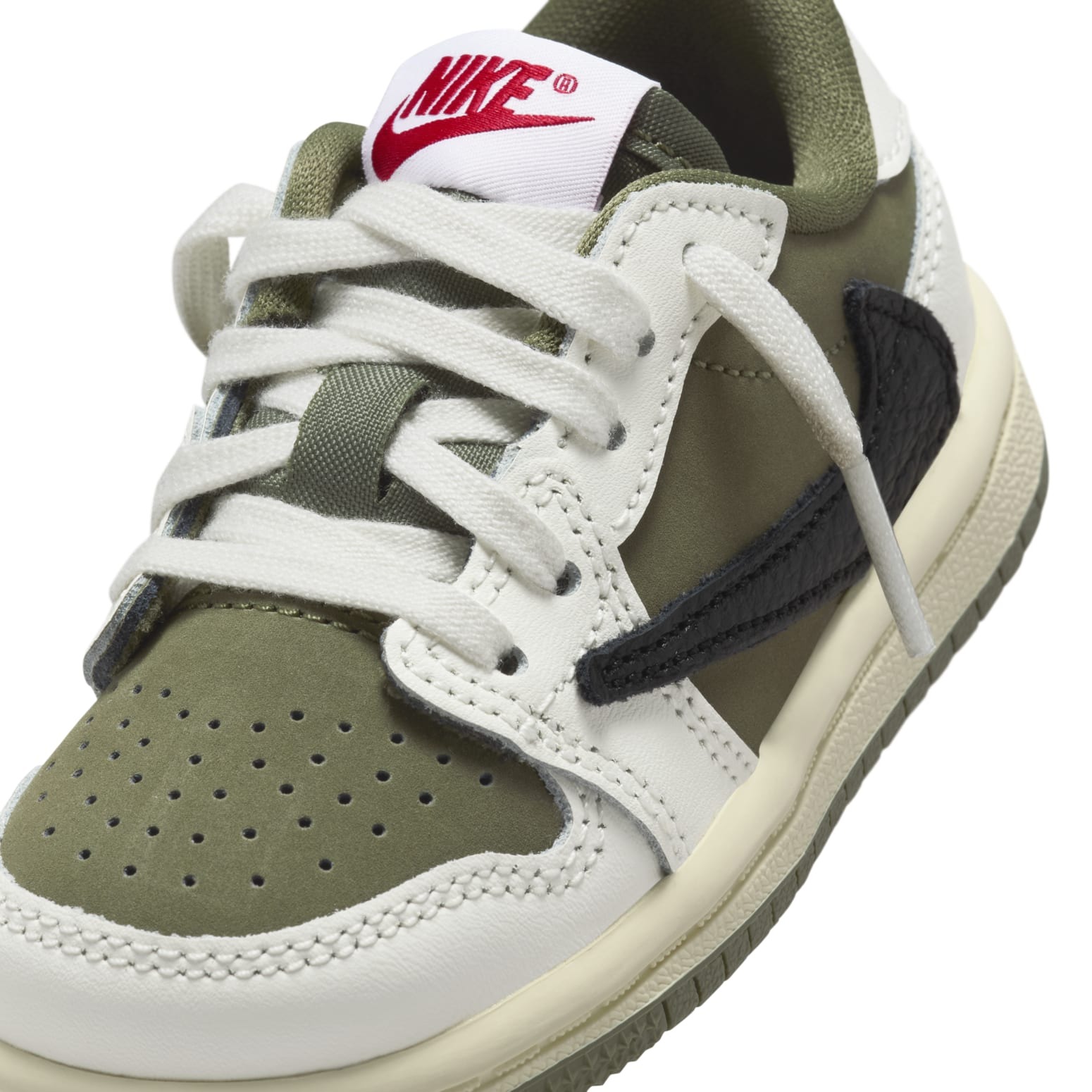 The Jordan 1 Retro Low OG SP Travis Scott Medium Olive (TD), in toddler sizes, is a low-top athletic shoe featuring a Medium Olive leather upper contrasted by Sail overlays and the Swoosh in black, placed in a reverse orientation. In red, the Nike, Travis Scott, and Jordan Wings logos accent the tongue and heel. The Muslin midsole and Medium Olive outsole complete the aesthetic. The Air Jordan 1 is one of the American athletic shoe brand Nikes crowning achievements for its unparalleled longevity and popularity. Travis Scott is a rapper, producer, and songwriter from Houston, Texas, whose records have topped charts since the 20-teens. Nike tapped Scott to apply his signature aesthetic to the Jordan 1 Retro, one of their iconic styles. The shoe comes with accessories, like pink and black laces. Our experts feel that the best features of the Jordan 1 Retro Medium Olive are the rounded toe cap, sole pattern, and ventilation holes of this limited-edition shoe. The Jordan 1 Retro Low OG SP Travis Scott Medium Olive (TD) was released on September 28, 2024, and retailed at $50.