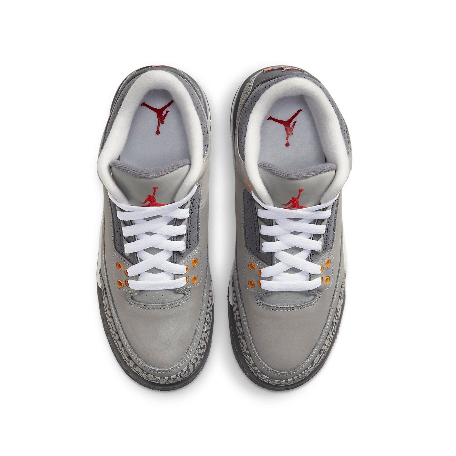 The Air Jordan 3 Retro Cool Grey 2021 GS is dressed in a mixture of silver, sport red, light graphite, as well as orange peel color way.The mid-top of this Retro Cool Air Jordan 3 for grade schoolers is clad in a neutral grey leather upper that is accented with overlays of tonal elephant print at the heel and the toe. The molded eyelets of this sneaker feature subtle pops of sport red and orange peel. A Jumpman printing at the heel and the tongue finishes the design.The Air Jordan 3 Retro Cool Grey 2021 GS was suggested to sell for $140 when it was first released on January 30, 2021.