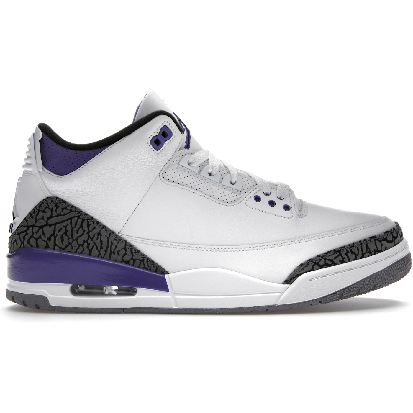 The Air Jordan 3 Retro Dark Iris is a high-top sneaker and comes in a white/black/Cement Grey/purple colorway.The leather base is primarily white with purple highlights around the heel and on the ankle. The shoe also has a black interior, plus a black-and-gray elephant print overlay. The Air Jordan 3 Retro Dark Iris is completed with a white midsole and Cement Grey outsole. The shoe features the Jumpman logo on the tongue and heel, with the ‘AIR’ brand logo below the Jumpman.The Air Jordan 3 Retro Dark Iris is set for release in August, 2022, at the retail price of $200.