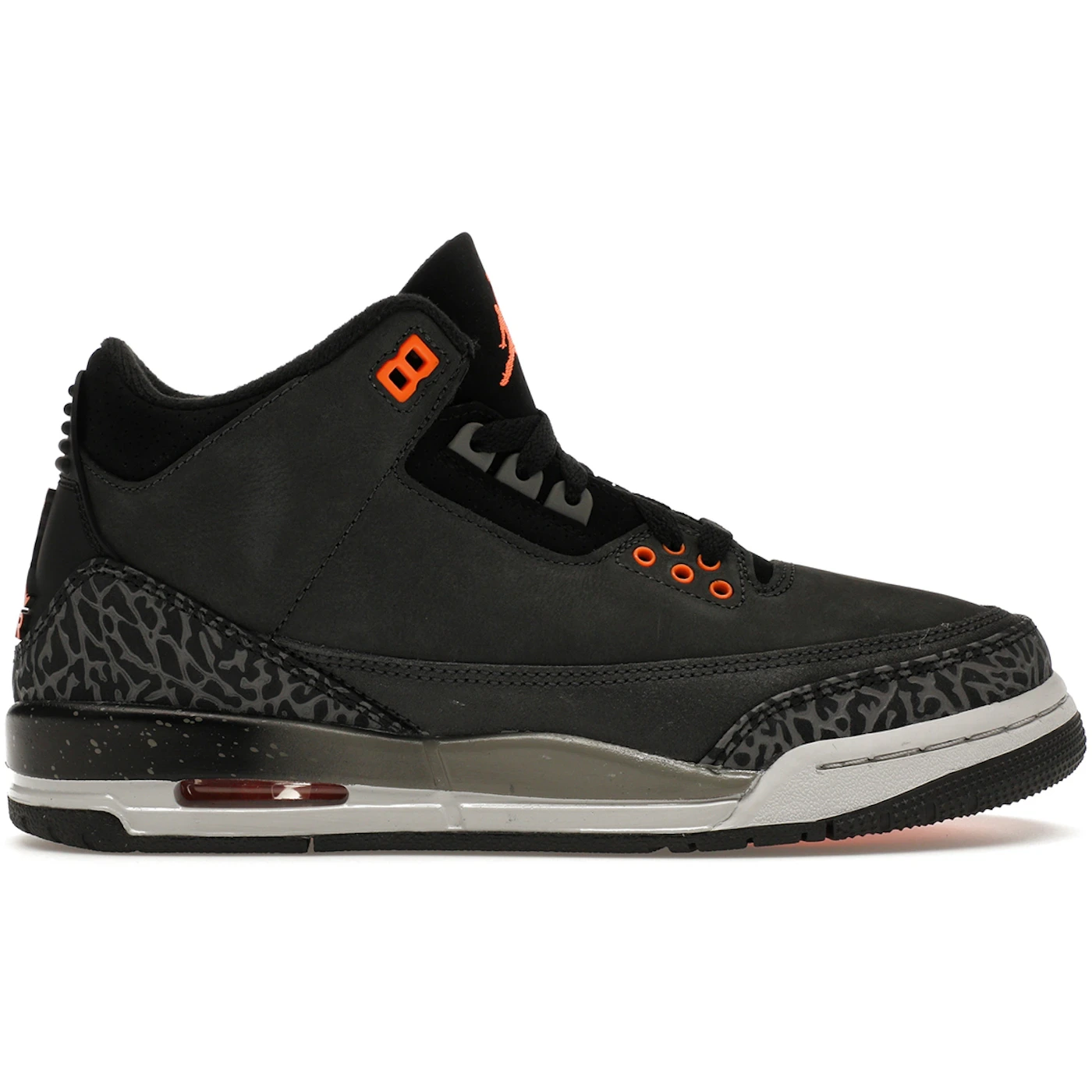 A decade after its initial release, the Jordan 3 Retro Fear Pack (2023) (GS) makes a comeback, this time tailored for grade school kids.A decade after its initial release, the design of the Fear Pack Jordan 3 Retro (2023) (GS) effortlessly merges tonal elephant print overlays with dark gray nubuck. The collar and tongue are adorned with black suede, highlighted by a Total Orange embroidered Jumpman logo Noteworthy Total Orange eyelets seamlessly merge with a Jumpman icon positioned on the back heel. Crafted for optimal comfort and longevity, the shoe incorporates an Air-sole unit tinged with orange and a polyurethane midsole that seamlessly blends three colors, presenting a fusion of performance and style.The standout characteristic of the Jordan 3 Retro Fear Pack (2023) (GS) lies in its vibrant Total Orange highlights across the Air Unit, eyelets, and Jumpman branding. This daring color choice serves as a tribute to Jordan’s bold and audacious spirit. The sneaker was originally sold for $150 on November 25th, 2023.