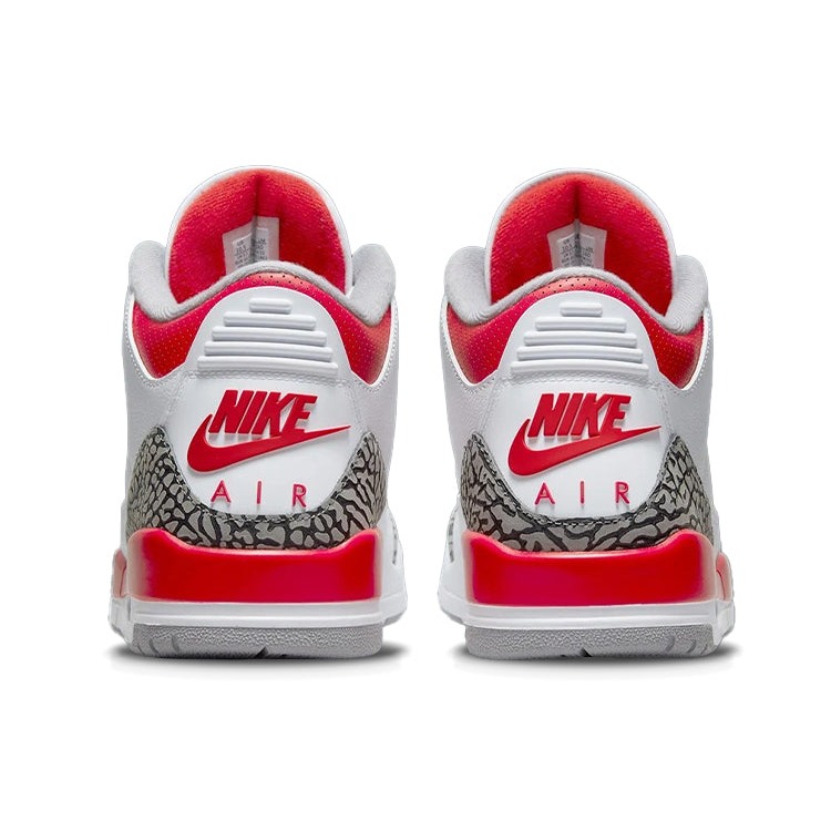 The Air Jordan 3 Retro Fire Red 2022 brings back an OG colorway from the year 1988.The top section of the Retro Fire Red is crafted from white leather with elephant print overlays done in dark gray at the heel and forefoot. The model also features contrasting fire red accents on the midsole, eyelets, and perforated leather collar. An airsole is nestled underfoot in the heel section, and the sneaker gets a fire red Jumpman on the tongue and a Nike Air logo on the heel.The Air Jordan 3 Retro Fire Red 2022 was released on the 10th of September 2022 and initially retailed for $210.