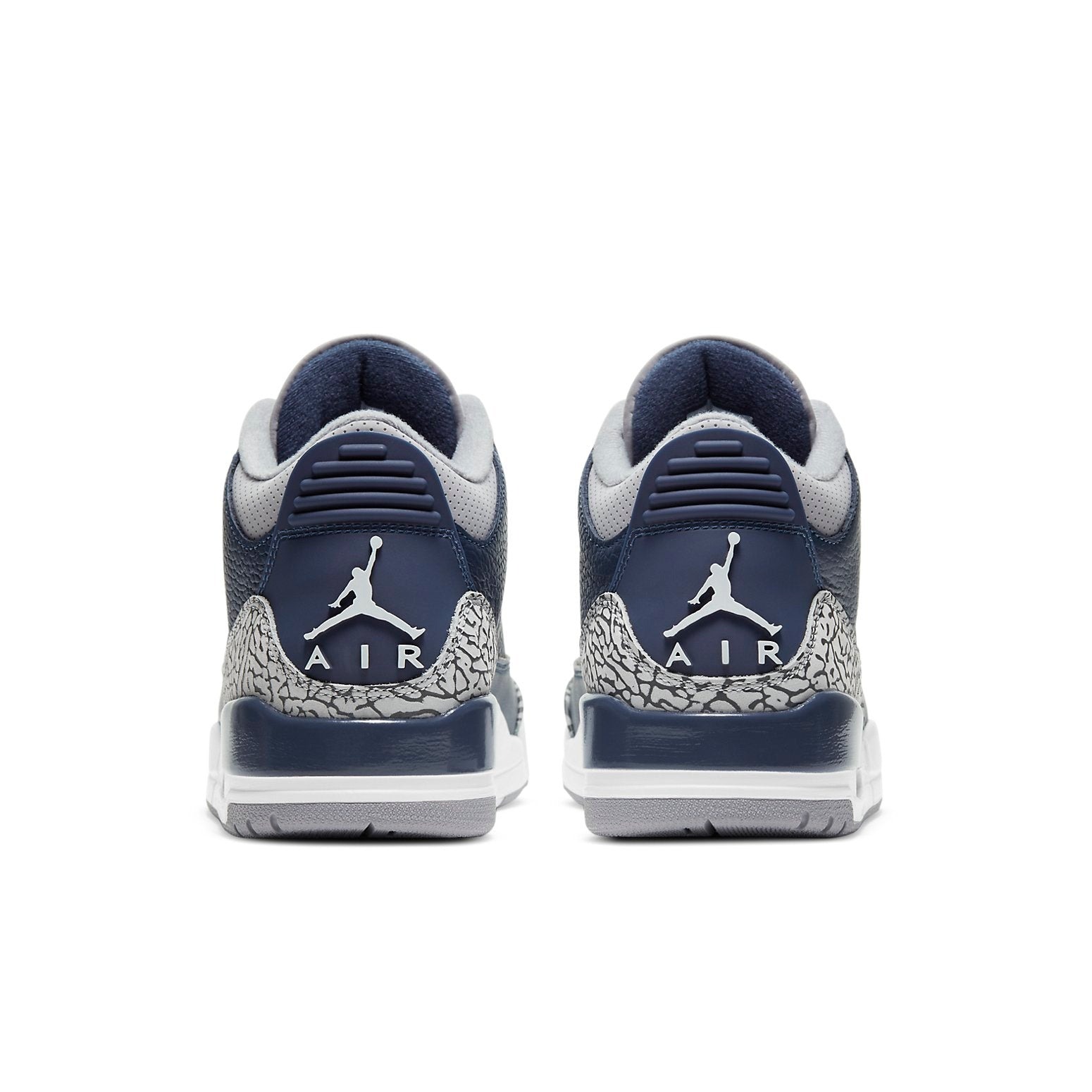 Jordan Brand embraced the spirit of the NCAA March Madness basketball tournament with the Air Jordan 3 Retro Midnight Navy. The colorway pays homage to the school colors of the Georgetown Hoyas, one of the most renowned college basketball programs in the NCAA. The upper of the Air Jordan 3 Retro Midnight Navy is composed mostly of a Midnight Navy tumbled leather while smooth perforated grey leather appears at the ankle and on the lacing system. In traditional Jordan 3 Cement styling, grey Elephant Print mudguards are located on the toe and heel. Jumpman logos on the tongue and heel tab, a grey Air Unit, and a white and grey sole completes this retro design. The Air Jordan 3 Retro Midnight Navy released in March of 2021 and retailed for $190.