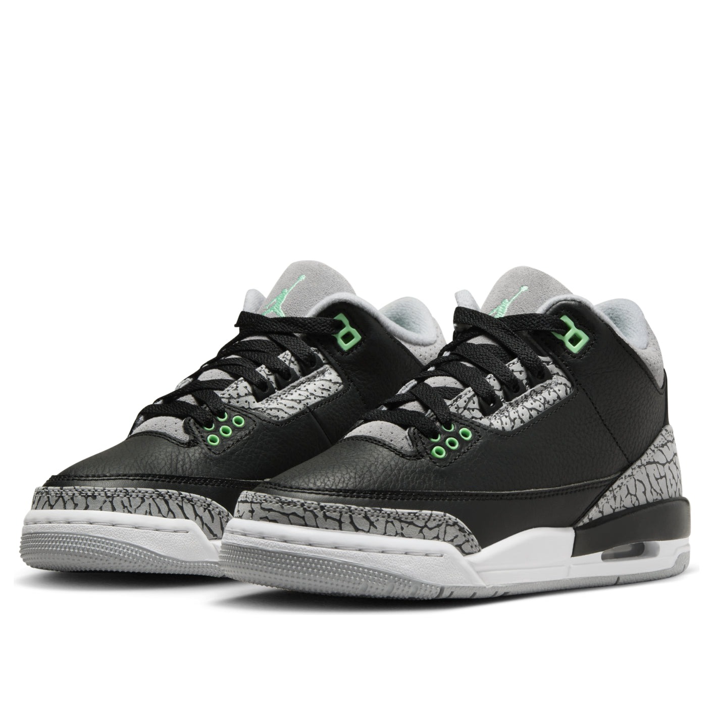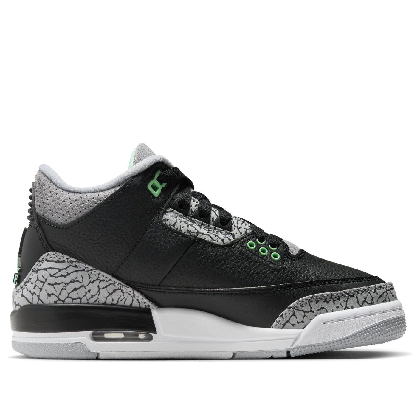 The Air Jordan 3 Retro Green Glow (GS) for grade schoolers is a stylish and iconic sneaker that pays homage to one of the most renowned Jordan models of all time.This shoe features signature Jordan 3 design elements, such as a leather upper with perforations for breathability as well as an elephant print overlay on the toe and heel. It prioritizes comfort with its cushioned midsole, Air-Sole units in the heel and forefoot, padded collar and tongue, and breathable interior lining. A predominantly black colorway allows the shoe s smaller details to take center stage.What our experts most appreciate about the Air Jordan 3 Retro Green Glow (GS) for grade schoolers, however, is the glow-in-the-dark elements subtly incorporated into the design at the shoe s toe perforations, eyelets, and Jumpman logo. This shoe originally retailed with a price tag of $150 when it was released on March 16, 2024.