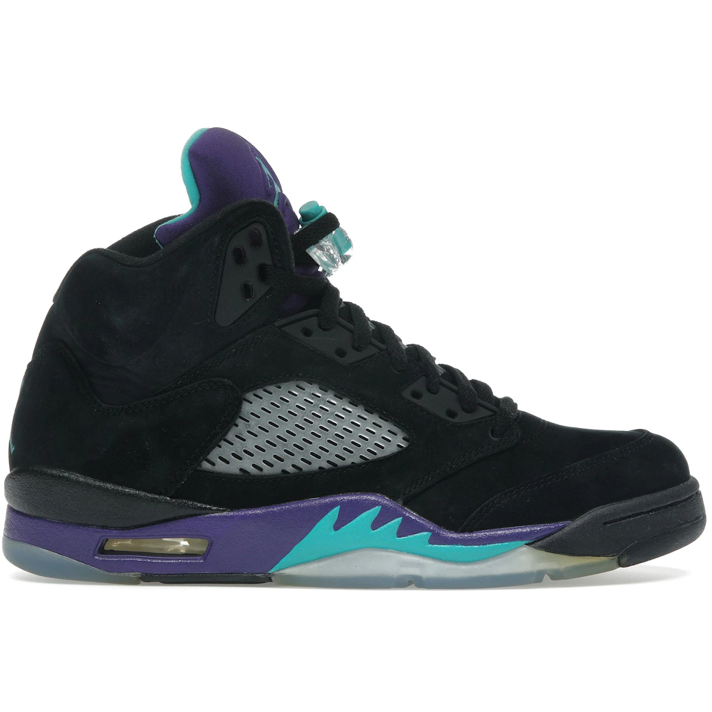 The three primary colors that dress the Air Jordan 5 Retro Black Grape 2013 include black, Grape Ice, and New Emerald.This 2013 Air Jordan 5 Retro shoe has a black nubuck upper with New Emerald and Grape Ice highlights. The midsole of this shoe stands out with purple and turquoise accents, while the iconic shark-tooth detailing of the Air Jordan 5 adds contrast against the Ice-Blue outsole. This sneaker comes with a black lacing system that finishes its look. This sneaker also features Nike’s signature Air cushioning technology. The midsole of the shoe incorporates Air-Sole units, which are pockets filled with pressurized air. The technology used in crafting the upper part of this sneaker involves a combination of synthetic materials, such as synthetic leather, mesh, and nubuck.The Air Jordan 5 Retro Black Grape 2013 made its market debut on June 15, 2013, with a retail price of approximately $160.