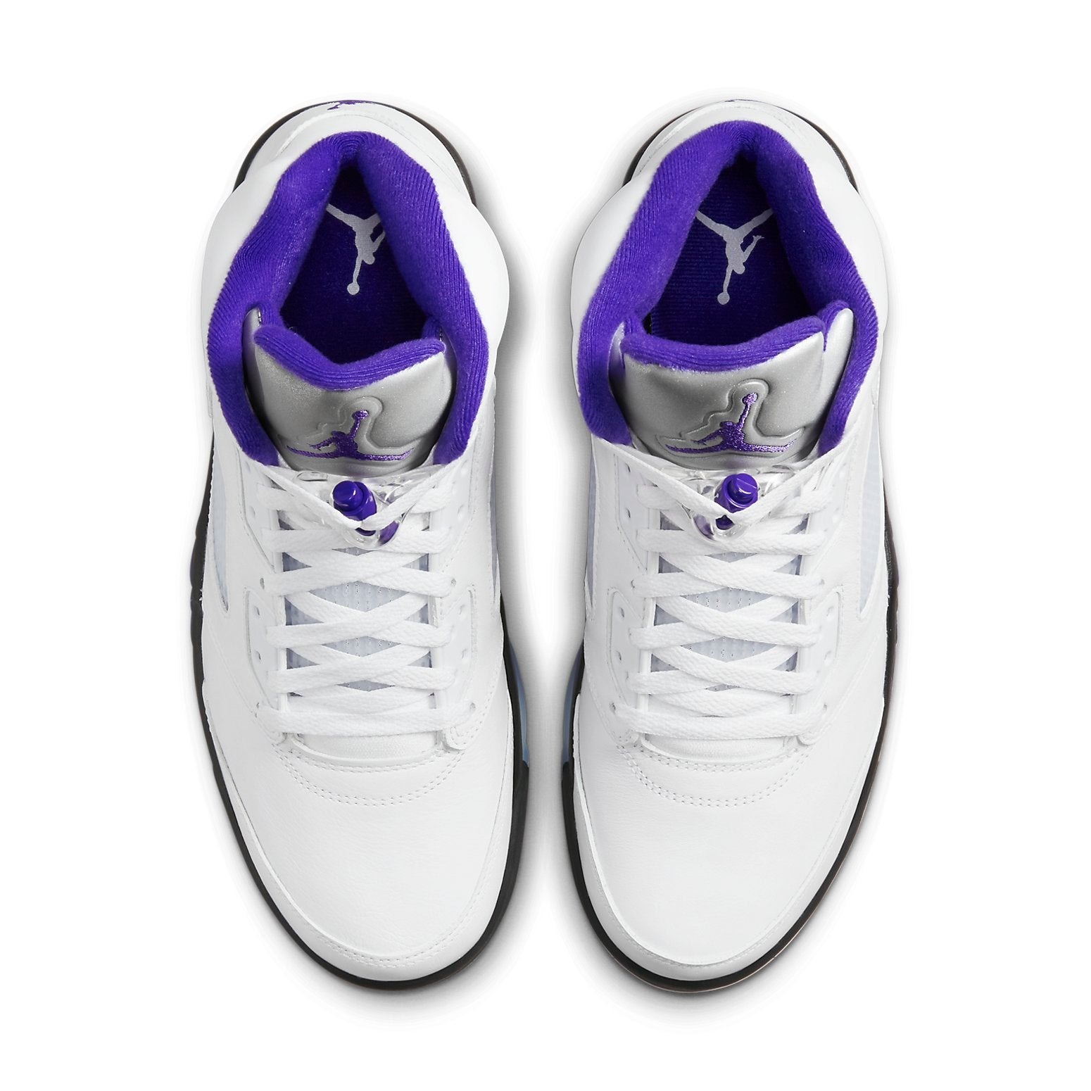 Jordan Brand paid homage to one of the most iconic Jordan 11 colorways with the Air Jordan 5 Dark Concord.Referencing the Jordan 11 Concord, the Air Jordan 5 Dark Concord features a smooth white leather upper with TPU netted underlays and reflective tongues. Hits of Concord on the embroidered Jumpman logos, midsole shark teeth, and sockliner bring a pop of color to the design’s neutral base. From there, a black midsole with a visible Air heel unit atop an icy semi-translucent outsole completes the design.The Air Jordan 5 Dark Concord released in August of 2022 and retailed for $200.