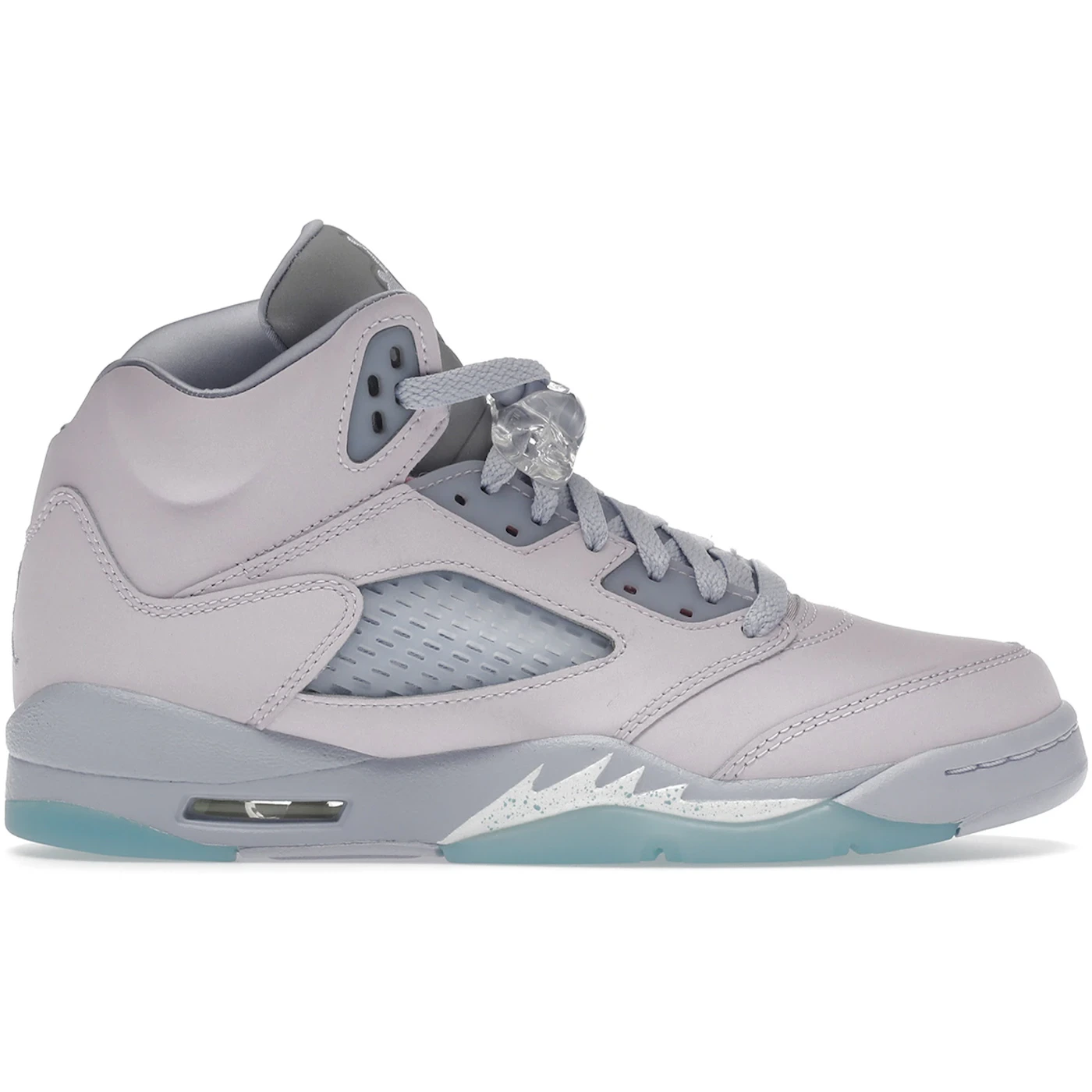The Air Jordan 5 Retro Easter 2022 (GS) for grade schoolers provides plenty of support and structure, making it a great shoe for both casual wear and basketball.This model was an Easter-themed release and has a white and blue sole with a white midsole. The base of the shoe is light pink leather, with patches of blue mesh included on the side panels. Light blue shoelaces lay on top of a metallic tongue that features the Air Jordan logo in the same light blue. The Air Jordan 5 Retro Easter 2022 (GS) for grade schoolers was first released in May of 2022. It had a starting retail price of $210.