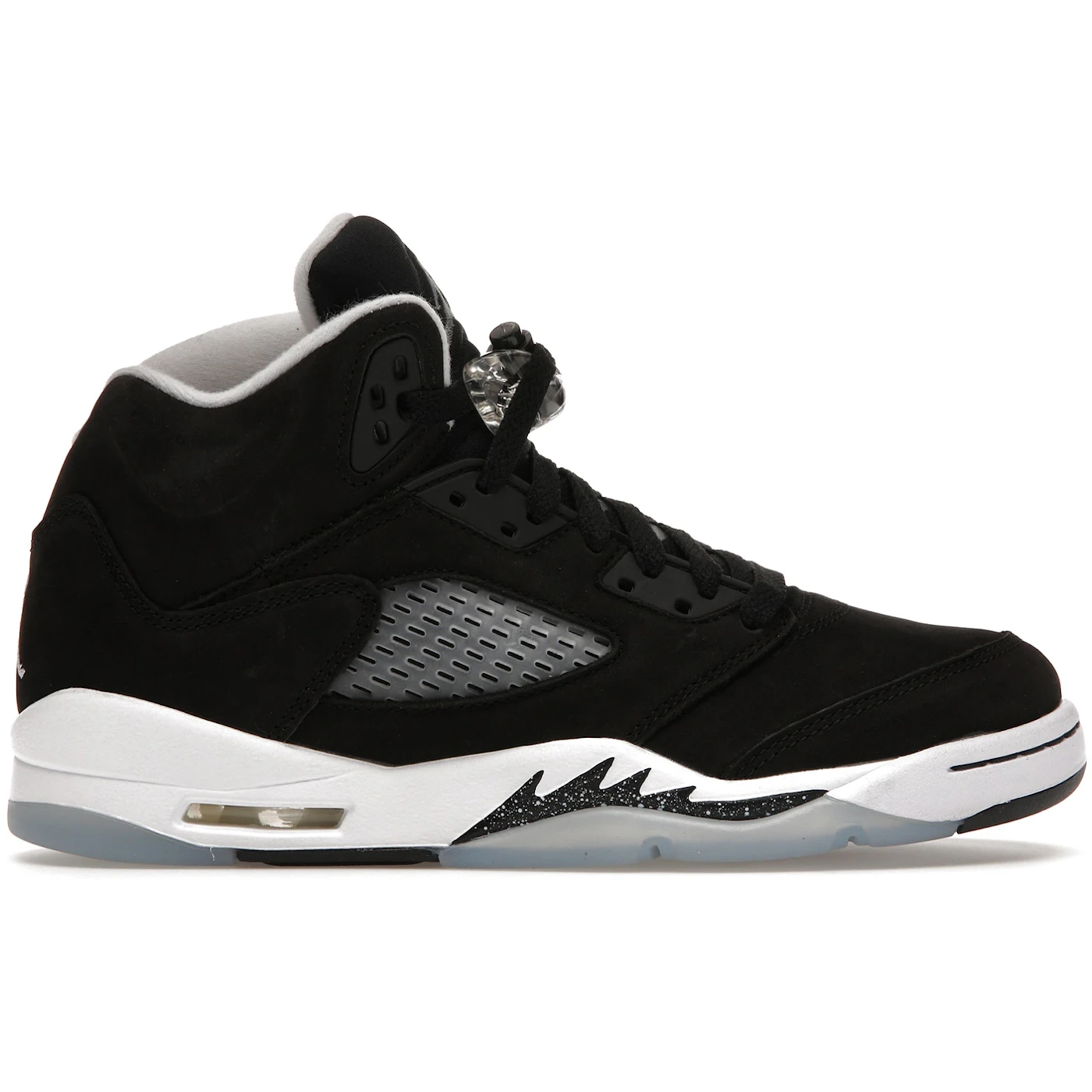 The Air Jordan 5 Retro Moonlight (2021) (GS) is a variant of the original 2013 Jordan 5 Oreo. Like the original, this shoe features a black nubuck upper, a gray embroidered Jumpman logo on its tongue, and translucent netting inserts on its sides. Furthermore, this Air Jordan 5 Retro Oreo shoe features white embroidered branding on its heel, a white midsole detailed with black shark teeth, and an icy translucent outsole. The icy translucent outsole contrasts the monotone upper.The grade school-sized Air Jordan 5 Retro Moonlight (2021) (GS) was released on 25th September. Originally, it had a retail price of $140.