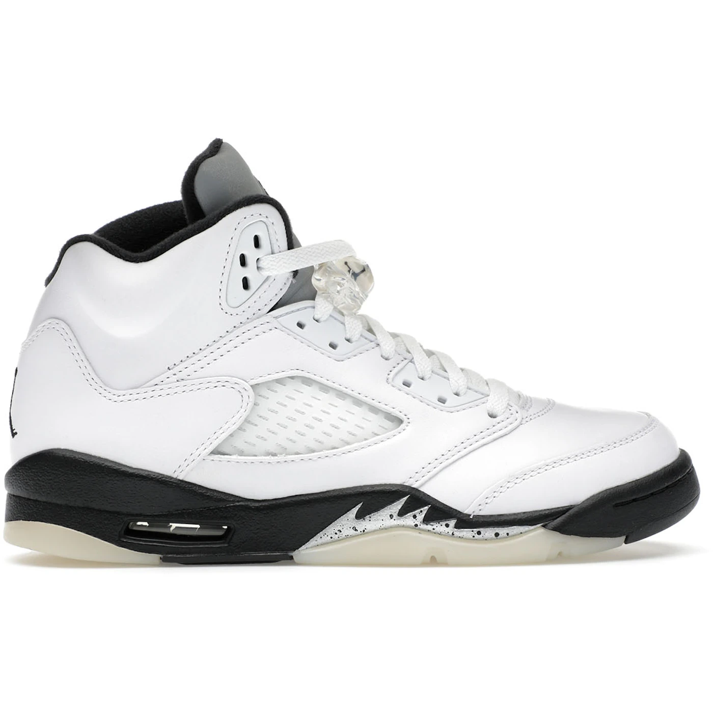The Jordan 5 Retro Reverse Metallic (GS) is a high-top silhouette in grade school sizing showcasing a crisp white, black, sail, and metallic-silver combination. The Jordan 5 Retro channels an old-school basketball feeling with its high collar and padded tongue. A clean white leather upper with signature net-style side panels is an ideal base to showcase black Jumpman logos throughout. There s one on the tongue, another on the heel, one on the lace lock, and underfoot you ll find the last one within the semi-translucent outsole. A visible Air unit in the black midsole and flat, white laces finish the design of this grade school-sized reverse metallic colorway. Our experts think that the jagged design piece on the midsole with white and black splatters gives the Jordan 5 Retro Reverse Metallic (GS) a dramatic effect. Released on December 7, 2024, this grade school-sized shoe sold for $150 retail.
