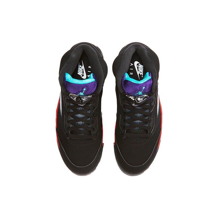 Jordan Brand celebrated the 30th Anniversary of the Jordan 5 by releasing the Jordan 5 Top 3, now available on Newsole. This colorway is a mash-up of some of the most memorable Jordan 5 colorways to ever release, featuring design elements from Fire Red, Metallic, and Grape colorways.This Jordan 5 is composed of a black nubuck suede upper with fire red detailing and translucent mesh underlays. A grape and aqua tongue, fire red and cement midsole, and classic translucent outsole completes the design. These sneakers released in May of 2020 and retailed for $200.