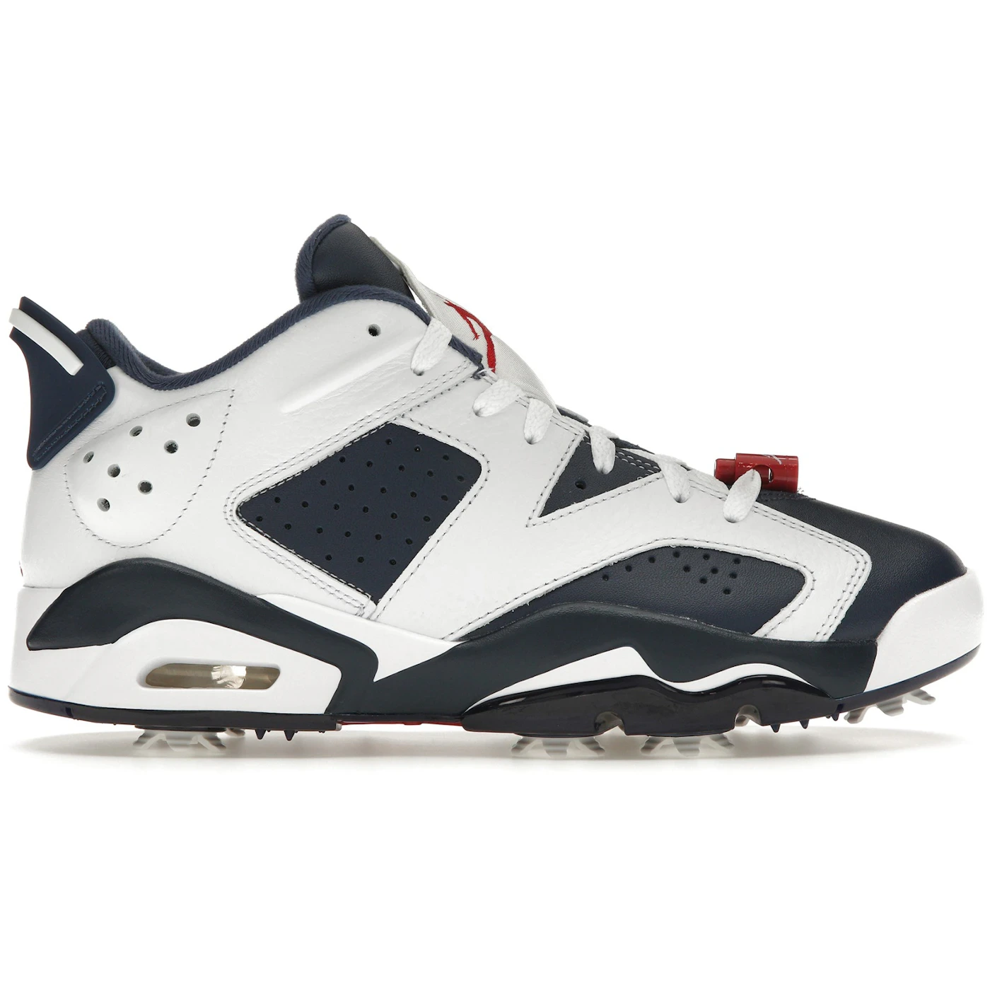 The Jordan 6 Low Golf Olympic brings the iconic Air Jordan 6 silhouette to the golf course with a patriotic twist. This men’s golf shoe features a clean white leather upper accented with varsity red and midnight navy details, paying homage to the colors of the American flag. The low-top design offers enhanced mobility on the green, while maintaining the classic Jordan 6 look with its distinctive side panels and visible Air unit in the heel. Designed for performance on the golf course, these shoes incorporate golf-specific features without compromising style. The outsole is equipped with removable spikes for excellent traction on various terrains, ensuring stability during your swing. The cushioned midsole provides comfort for walking the course, and the padded collar offers additional ankle support. With its blend of athletic heritage and golf functionality, the Jordan 6 Low Golf Olympic is perfect for golfers who want to make a statement on the links. Us at Newsole believe this product is great for golf enthusiasts who appreciate the fusion of iconic basketball sneaker design with practical golf shoe technology, offering both style and performance on the course.