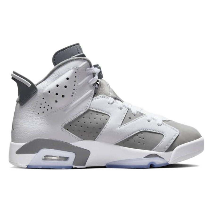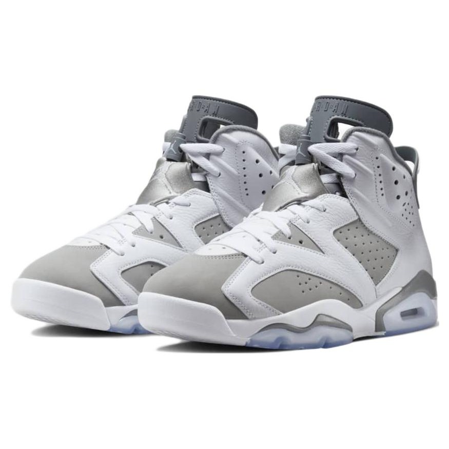 Jordan is bringing back the Cool Grey colorway for the first time since the release of the Air Jordan 11 Retro Cool Grey in 2021, with the release of the Air Jordan 6 Retro Cool Grey. The Air Jordan 6 Retro Cool Grey appears with white leather uppers, and grey nubuck paneling, a similar pattern as used on the Air Jordan 6 UNC White. The retro sneakers sit on top of an icy blue outsole, similar to the Air Jordan 11 Retro Cool Grey, and come with gray lace locks with white Jordan branding.The Air Jordan 6 Retro Cool Grey released February 25, 2023, with a retail price of $200.