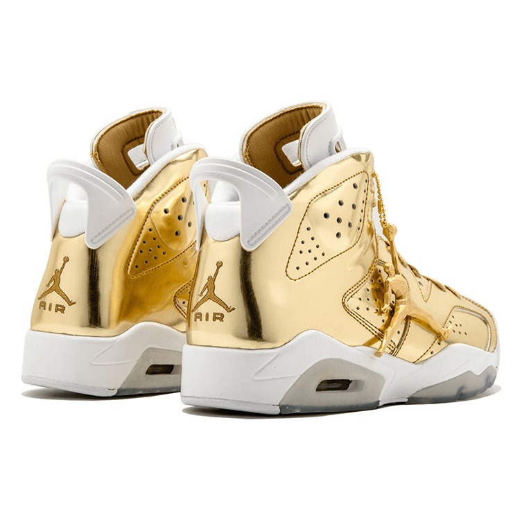 Released to celebrate the 25th anniversary of Michael Jordan s first NBA Championship, the Air Jordan 6 Retro Pinnacle Metallic Gold is a retro-inspired Air Jordan 6 sneaker from the Air Jordan Retro Pinnacle lineup. This sneaker features a shiny Metallic Gold Upper made of patent leather with Gold laces. White detailing appears on the tongue, sockliner, and plastic heel pull tab. Branding details appear on the tongue, heel, lacelock, insole, and outsole. A White midsole with a visible Air window at the heel and an icy translucent outsole completes the design. Each pair comes with Gold lacelocks, a Gold Jumpman hangtag, and a tote bag. What our experts love about this sneaker is its monochromatic colorway and construction. The monochromatic Gold colorway gives this sneaker an eye-catching design, while the patent leather build gives it a luxurious look. The Air Jordan 6 Retro Pinnacle Metallic Gold was released on October 22nd, 2016, for a retail price of $250.