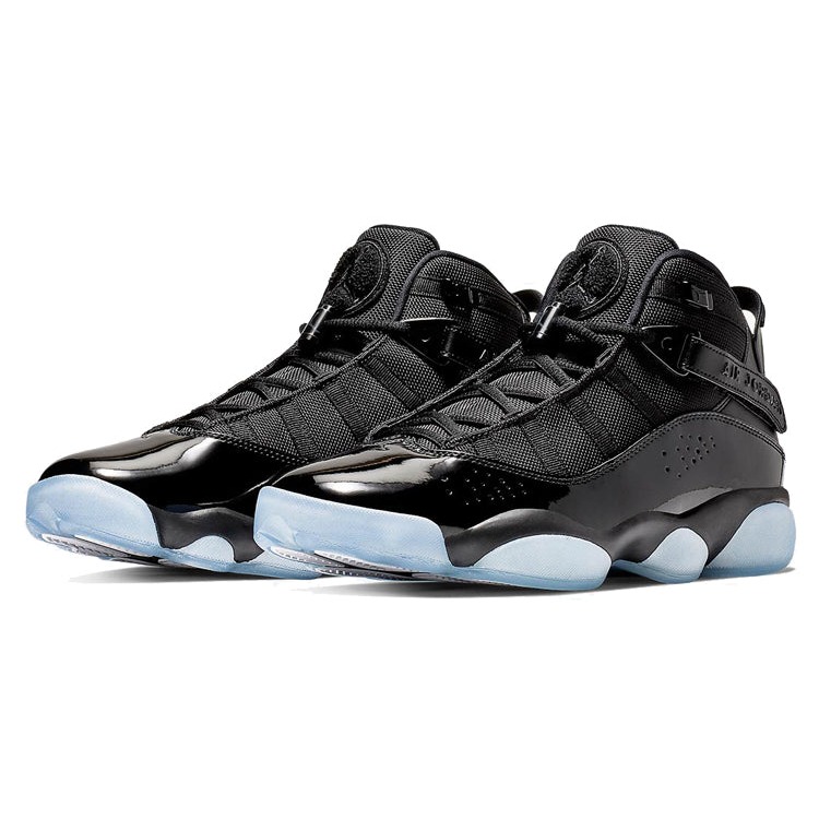The Air Jordan 6 Rings Black Ice is a premium quality sneaker by Nike.The 6 Rings Air Jordans by Nike showcase a ballistic mesh upper in black tones with matching patent leather accents on the heel and mudguard. The sneaker also boasts a toggle lacing system with an integrated buckle strap, an icy translucent outsole, and a cushioned midsole for support. The sneaker has a black ice colorway that features a black upper with a ballistic mesh construction on the tongue and side panels.The Air Jordan 6 Rings Black Ice was released on January 1, 2019, with its retail price set at $165.
