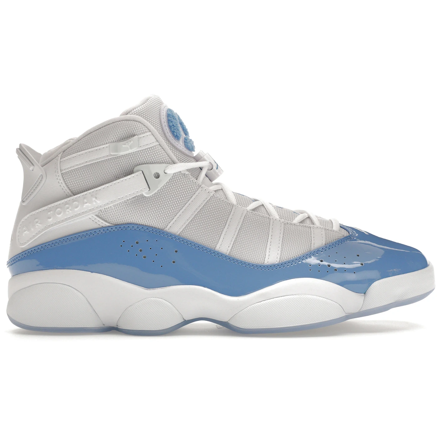 In tribute to the University of North Carolina, the Air Jordan 6 Rings UNC sneakers deliver a playful yet slick high-top shoe for your best ball and sneaker game.Inspired by the color scheme behind UNC, these basketball sneakers join the Air Jordan 6 camp of high-tech, super stylish shoes. With a white and grey mesh base, a powder blue patent leather detail pops. The iconic Jumpman logo of the Air Jordan brand sits embroidered on the tongue inside a blue fleece patch. The TWO3 branding sits along the forefoot. At the back heel sits an embossed Jumpman logo, while the Air Jordan text brands two backward-facing Velcro straps that cross over the lace enclosure of the ankles. Midsoles provide thick cushioning for that extra leap.We love the fresh, breezy color palette on this bold design of this 6 Rings sneaker. The glossy patent leather against the subtle base brings them to life as a high fashion statement, making them more than just a performance sports shoe. The Air Jordan 6 Rings UNC sneakers were released on 11 February 2020, priced at $170.