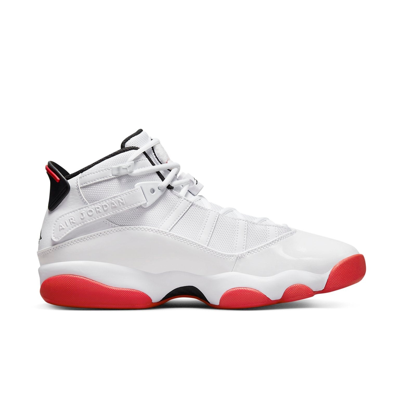 The Jordan 6 Rings White University Red Black pays tribute to Michael Jordan s legendary career with a Chicago Bulls-inspired colorway of University Red, white, and black. The white upper is crafted from leather, synthetic leather, and textile, which matches the tonal laces, part of the tongue, the Jumpman logo near the toe, and most of the midsole. The patent leather mudguard, the insole, and the laces toggle come in black, while red accents can be found on the outsole, the upper eyelets, and the tongue s Jumpman logo. The heel and forefoot house Zoom Air units, providing responsive cushioning without weighing down the foot. Overall, the sneaker has a lightweight build and showcases plenty of classic Jordan branding. Our experts at Newsole appreciate the inclusion of a heel pull tab, which eases putting on and taking off the shoe. The Jordan 6 Rings White University Red Black was released on March 31, 2023, and sold for $170.
