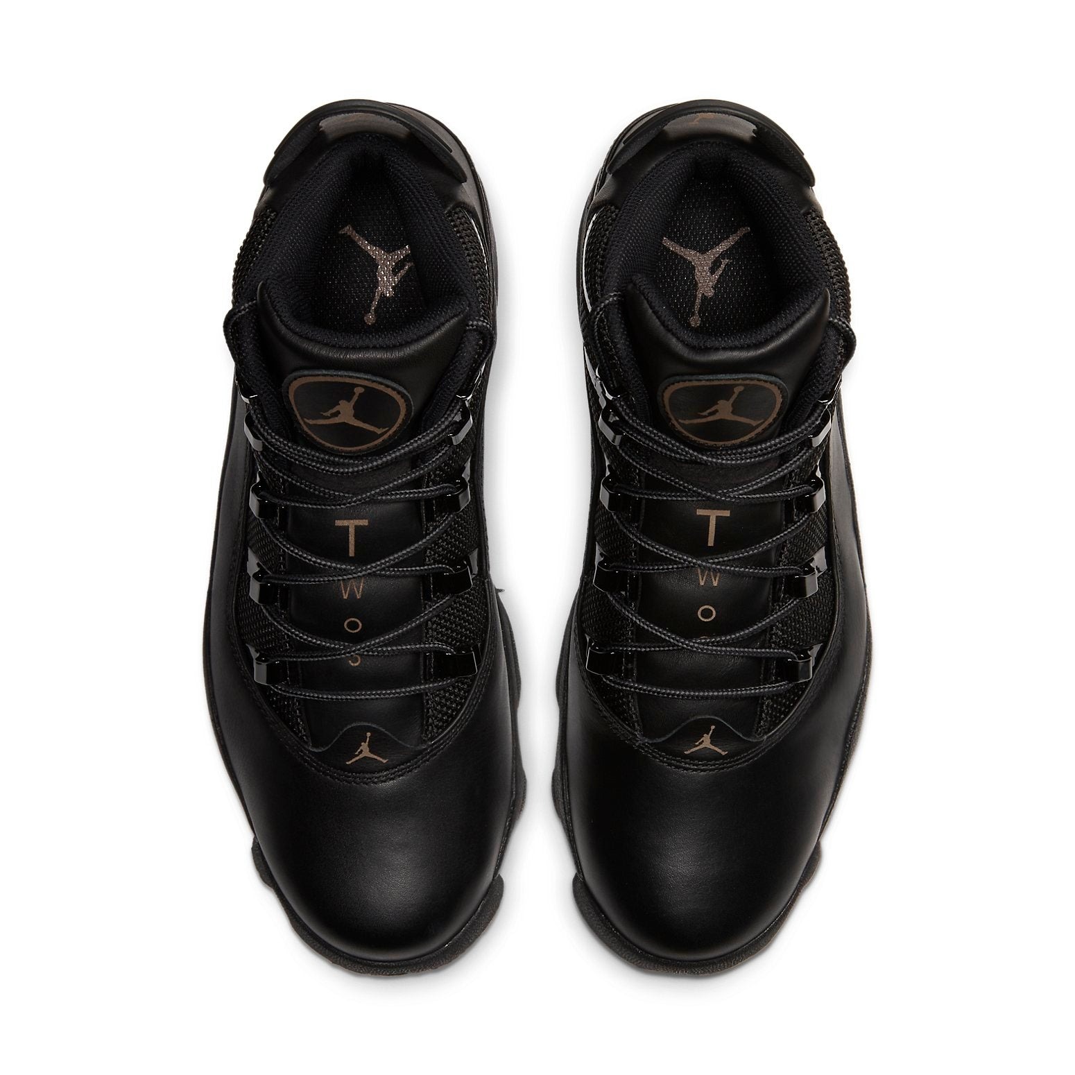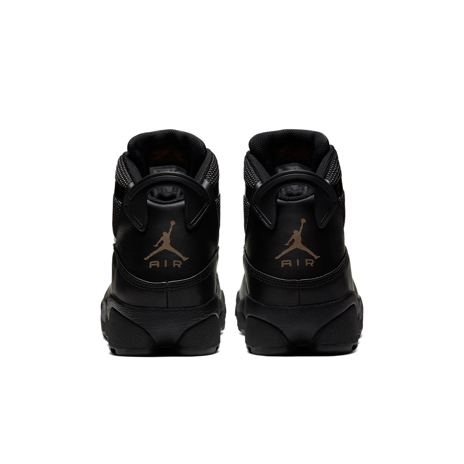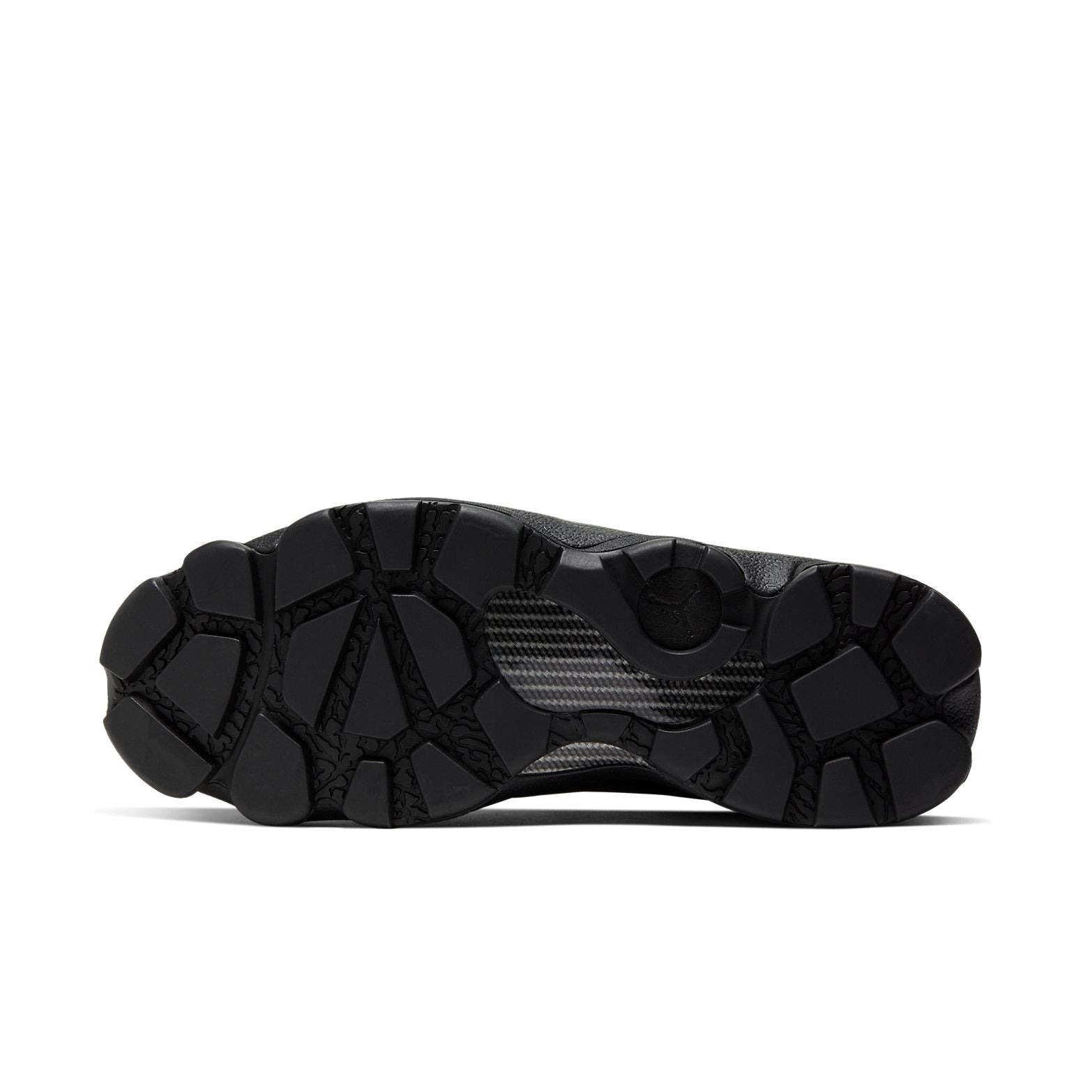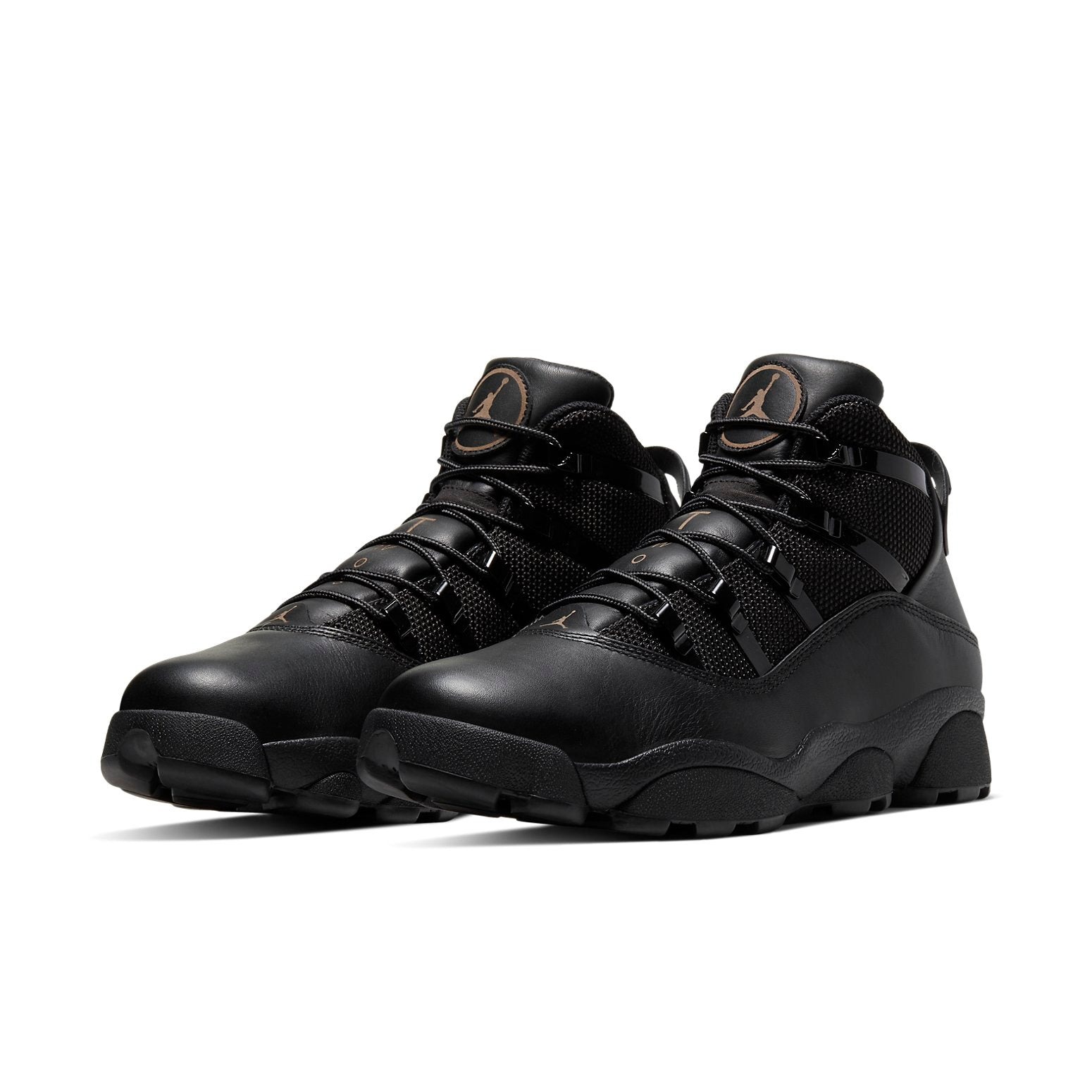 The Jordan 6 Rings Winterized Black (2019) is a sturdy, all-weather shoe that pays homage to Michael Jordan’s six NBA championships and fuses elements from seven different Air Jordan silhouettes that he wore in those games. The 2019 Winterized Jordan 6 Rings in Black is a mid-top sneaker that features a durable upper with a base of black ballistic mesh. This is overlaid from toe box to heel counter in premium black leather, and a pull tab at the heel facilitates on/off. Black rope laces thread through metal eyelets to cross over a black padded tongue that sports a brown and black circular Jumpman patch. A brown Jumpman logo also adorns the heel counter, black insoles, and the bottom of the laces. “TWO 3” branding, which references Jordan’s number, graces each tongue. What we appreciate most about this sneaker is the heavy-duty sole. A black foam midsole contains Zoom Air for ultimate cushioning and springy energy return. A black rubber outsole features thick lugs for multi-directional grip on a variety of surfaces. The Jordan 6 Rings Winterized Black (2019) was released on January 1, 2019, for a retail price of $165.