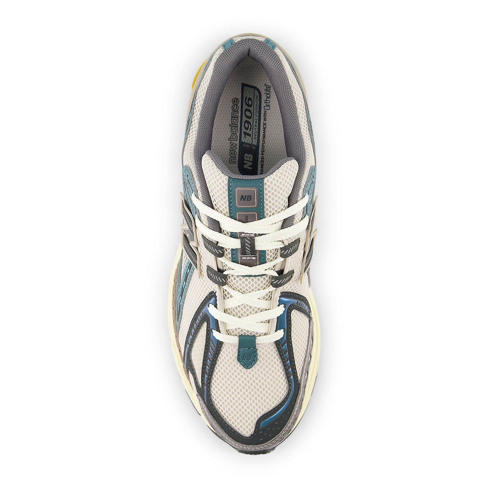 The New Balance 1906R Metallic Teal New Spruce is a running shoe inspired by the 2000s era of runners style with a bold color blocking scheme.This iteration of the New Balance 1906R is made with a white and off-white mesh base for breathability. The shoe features overlays of Metallic Teal running across the sides of the shoe as well as the toe box. The toe box is rounded out with a perforated metallic silver overlay. The classic New Balance N logo appears on each side of the shoe in brown with “NLock” branding. 1906R branding can also be found on the lateral side of the heel on the overlay. The heel is supported by a khaki plastic heel counter complete with a small NB logo. What provides most of the support, though, is the ABZORB midsole. The outsole is a combination of gray, beige, and yellow and is branded with the Nergy logo.Our favorite thing about this shoe is the presence of Stability Web technology in the outsole, which provides additional support to the arch. The New Balance 1906R Metallic Teal New Spruce was released on March 24, 2024, for a price of $160.