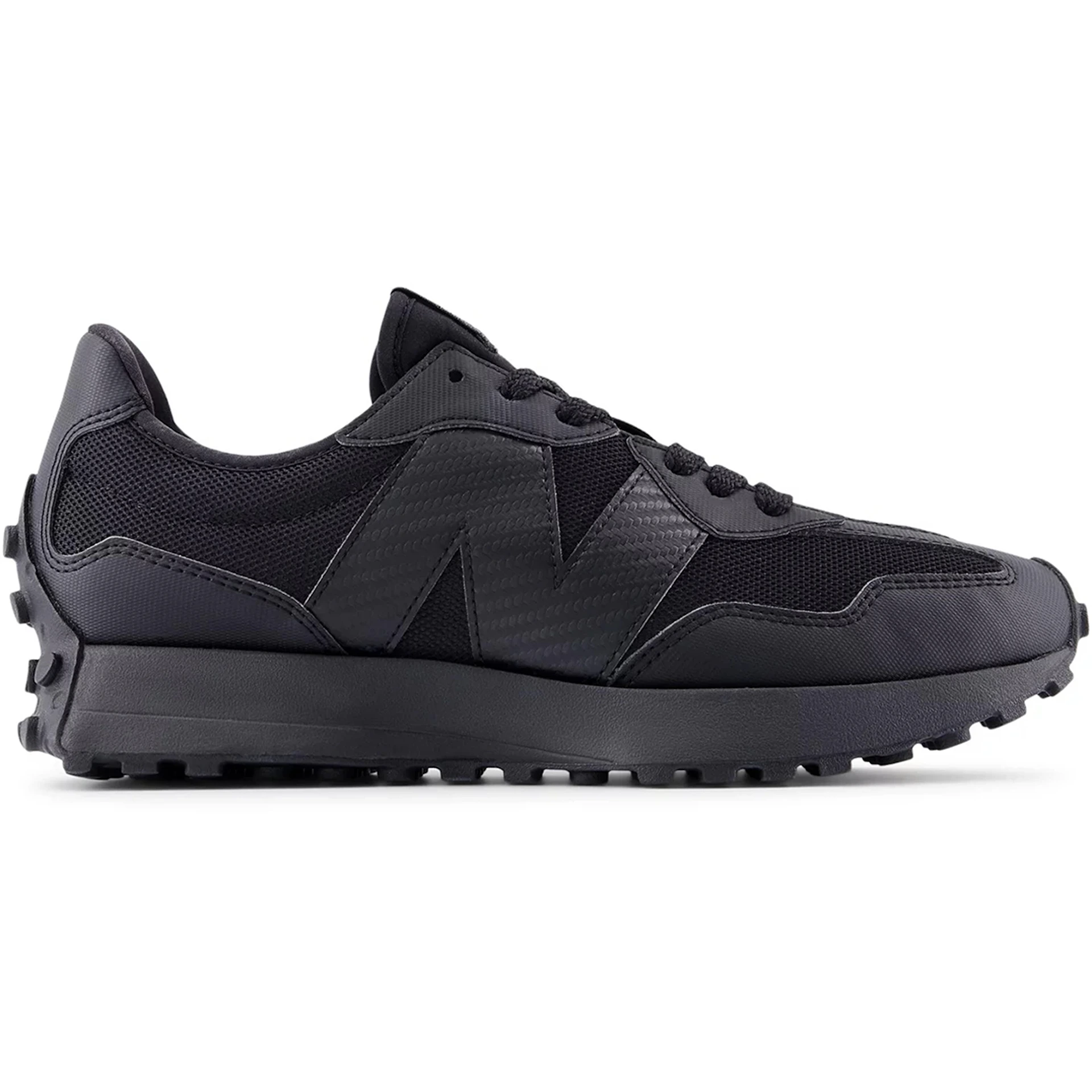 The New Balance 327 Black Carbon Fiber Logo features a Black/Black colorway. This New Balance 327 was first released for $105.
