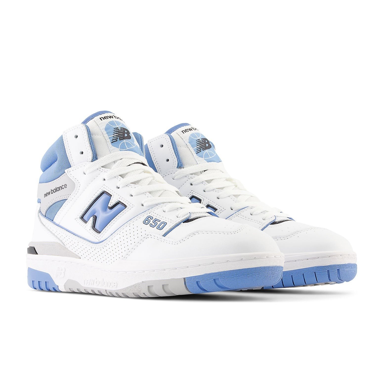 The New Balance 650 White Heritage Blue features a White/Heritage Blue/Raincloud colorway. This New Balance 650 was first released for $130 on September 14, 2023.