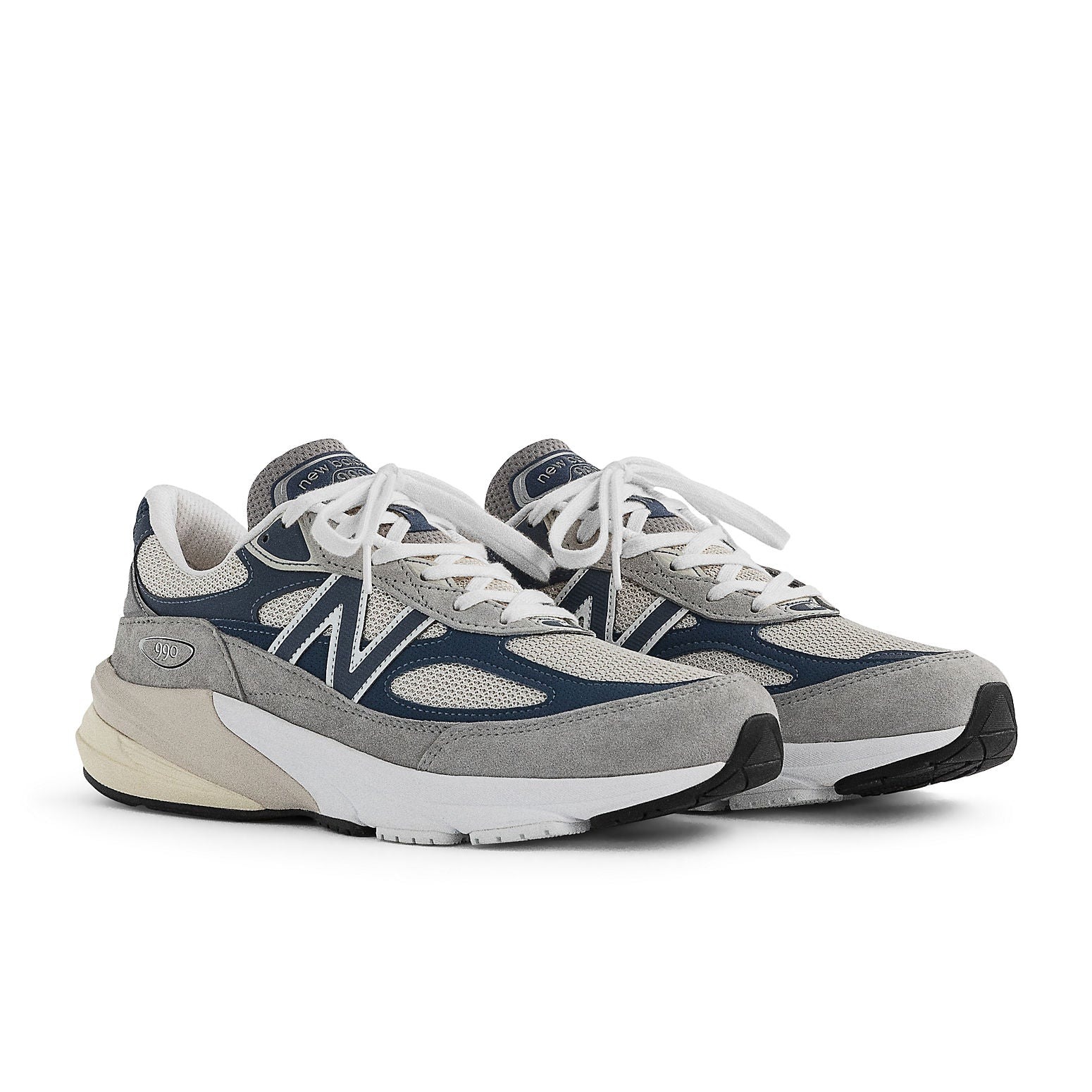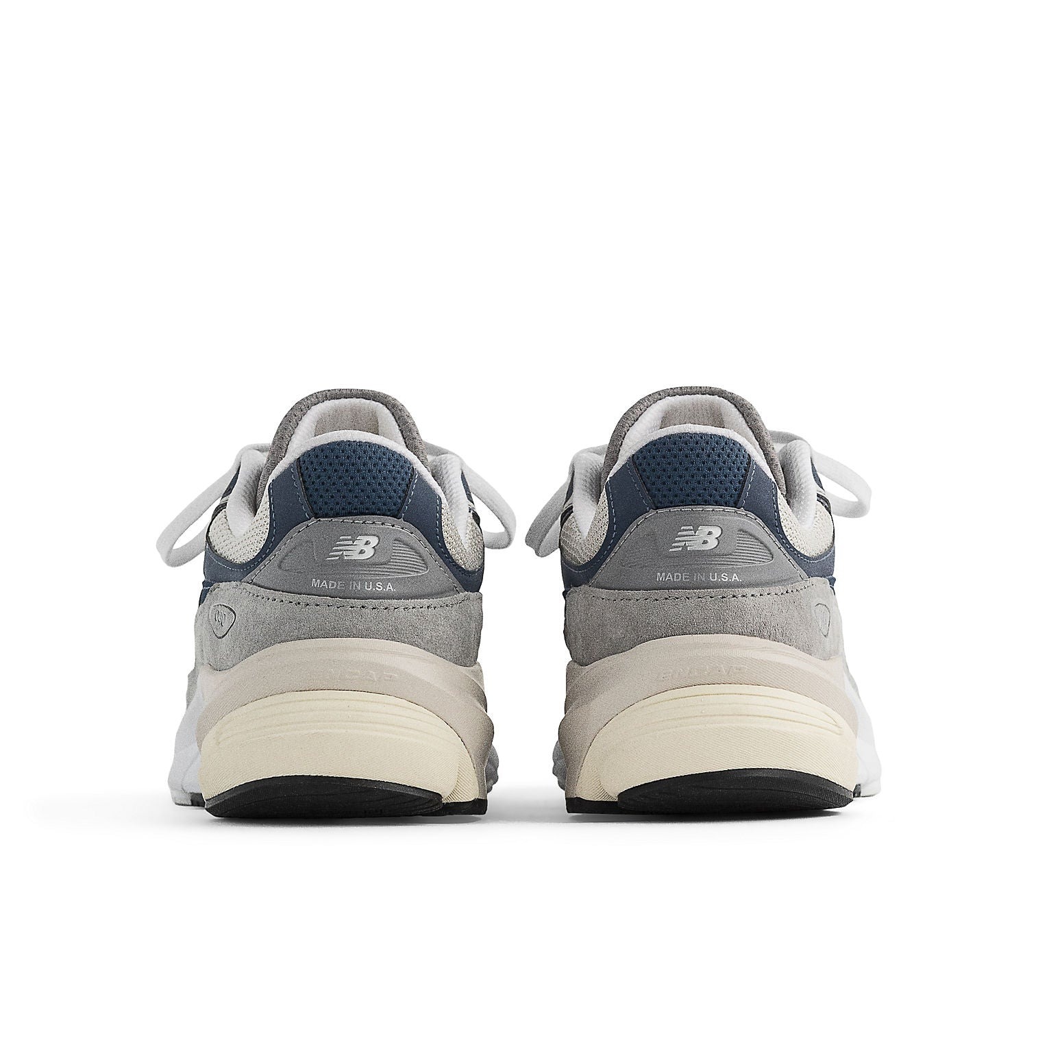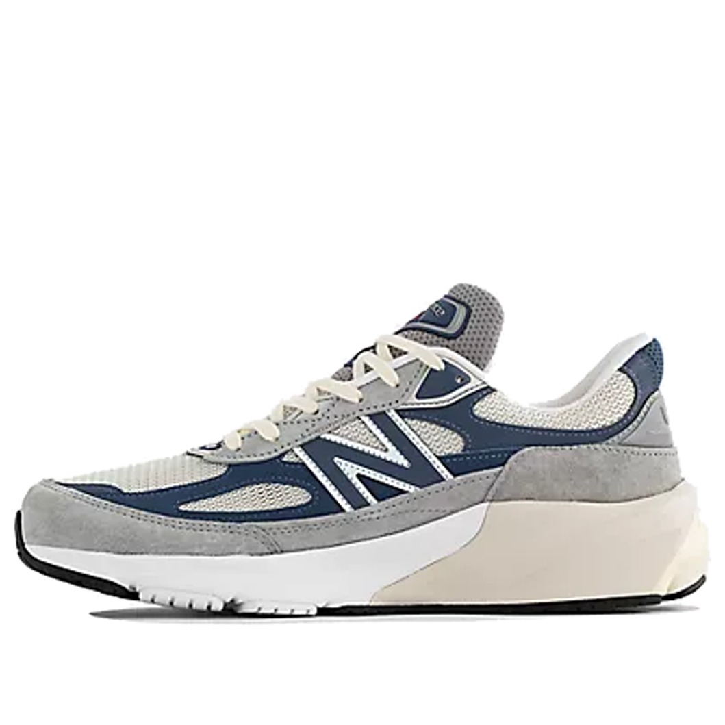 The New Balance 990v6 MiUSA Gray Day (2023) is a running sneaker from the New Balance Gray Day 2023 lineup featuring the 990v6 MiUSA silhouette. This New Balance 990v6 MiUSA (Made in USA) offering features an Off-White mesh base with navy suede overlays and gray pigskin suede on the mudguard and eyestays. More navy blue hits feature on the signature N logo on the sides, which has a white outline. Other details include 990 branding on the lateral heel, a mesh tongue with a branded patch, cream-colored laces, and the signature NB logo at the heel with MADE IN USA typography beneath it. A sole unit with an ENCAP-cushioned midsole and a rubber outsole completes the design. Something we love about this New Balance sneaker is its unique design, cushioning technology, and colorway, which make it perfect for everyday wear. The New Balance 990v6 MiUSA Gray Day (2023) was made available on May 12th, 2023. Initially, it retailed at $220.
