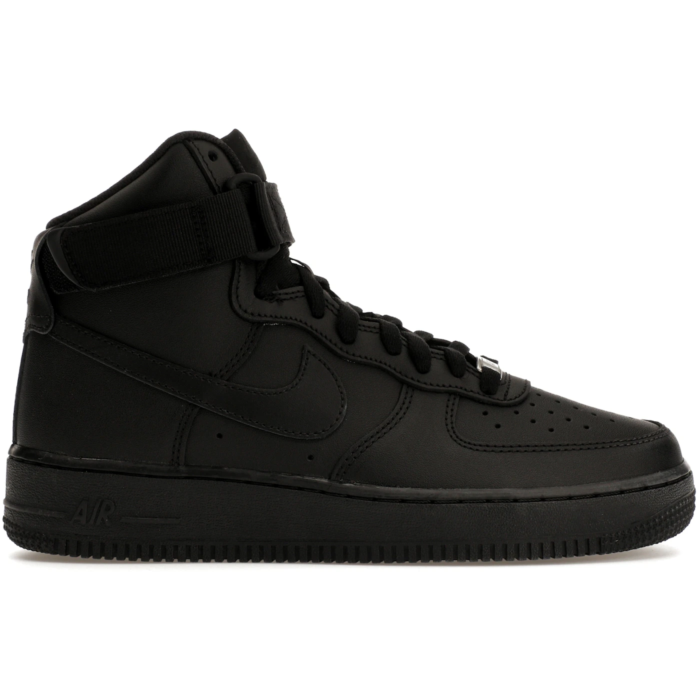 The Nike Air Force 1 High Triple Black (2017-2020) is a high-top Air Force 1 sneaker in a Triple Black colorway.This sneaker features an all-black smooth leather upper with a tonal Swoosh on the laterals and medials. Other details include tonal laces, an ankle strap, a perforated toe box, tonal branding on the tongue tag, and an oval-shaped silver dubrae with the trademark AF1 branding. The traditional Air Force 1 sole unit in an all-black tone matching the upper rounds out this sneaker s design. The Nike Air Force 1 High Triple Black (2017-2020) was made available on January 1, 2017 for a retail price of $100.