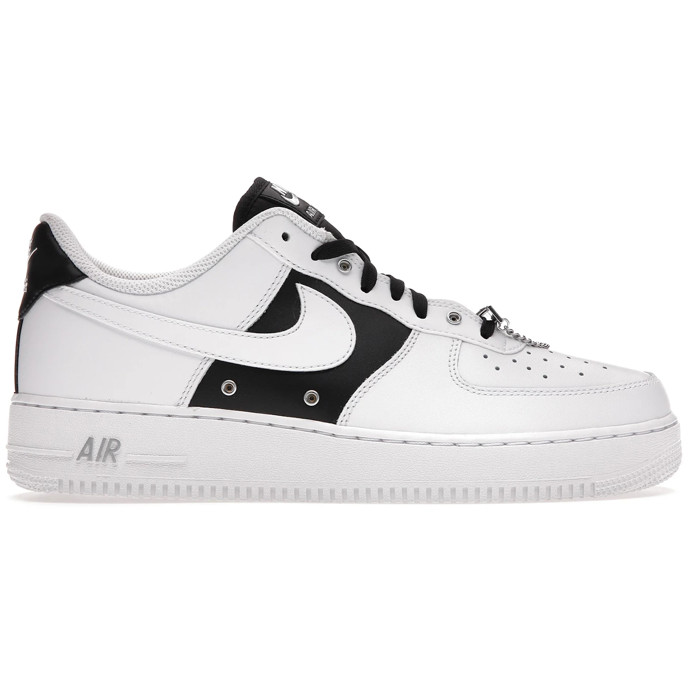 The Nike Air Force 1 Low ’07 PRM Silver Chain features a mix of different hues that define its appearance, with white, Metallic Silver, and black featuring as the major tones.This Nike Air Force 1 Low ’07 PRM Silver Chain Air Force 1 sneaker showcases the iconic Swoosh logo. This shoe also comes with a distinctive embroidered logo that features at the back. The shoe also includes contrasting panels, perforated details, a round toe, a logo patch on the tongue, a branded insole, as well as a rubber sole that complete its look. This sneaker also comes with a black lace-up closure system at the front.A rubber sole system that enhances its stability is one feature that was found by our experts to be the most eye-catching for the Nike Air Force 1 Low ’07 PRM Silver Chain. At the time when this sneaker hit the market on August 21st, 2021, it had a recommended retailing value of $135.