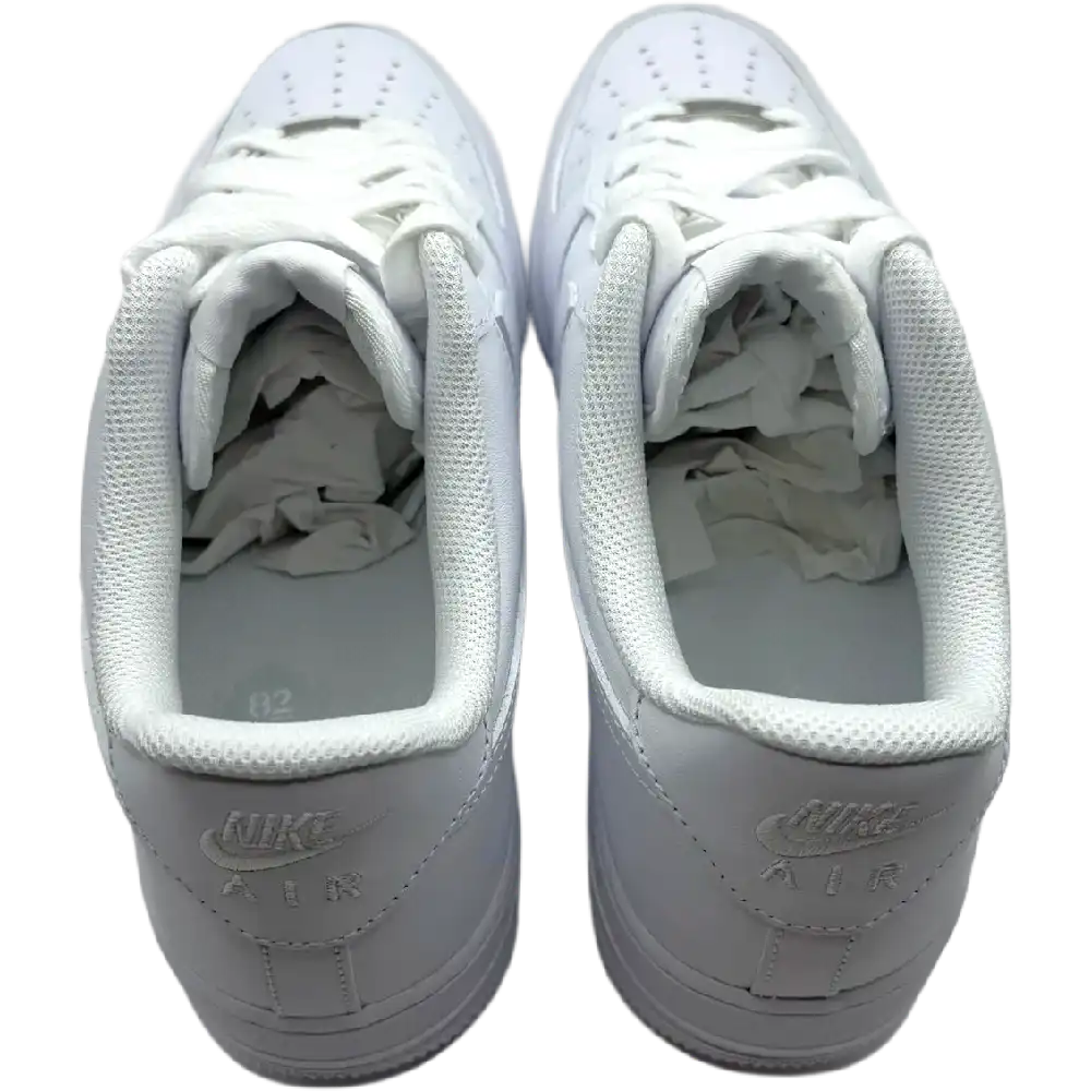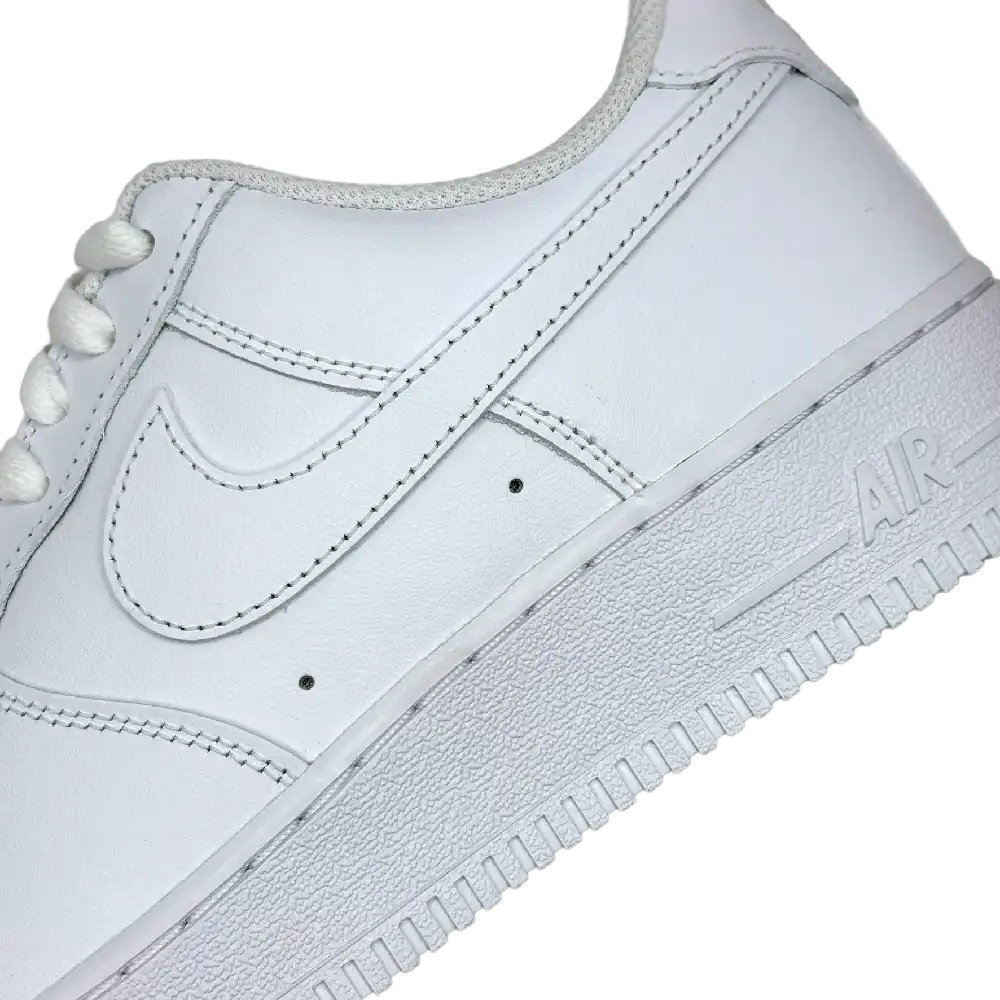 The all-white leather upper of the Nike Air Force 1 Low White ’07 has Swoosh overlays and a perforated toe box. The design is finished with a white sole and Nike heel embroidery.