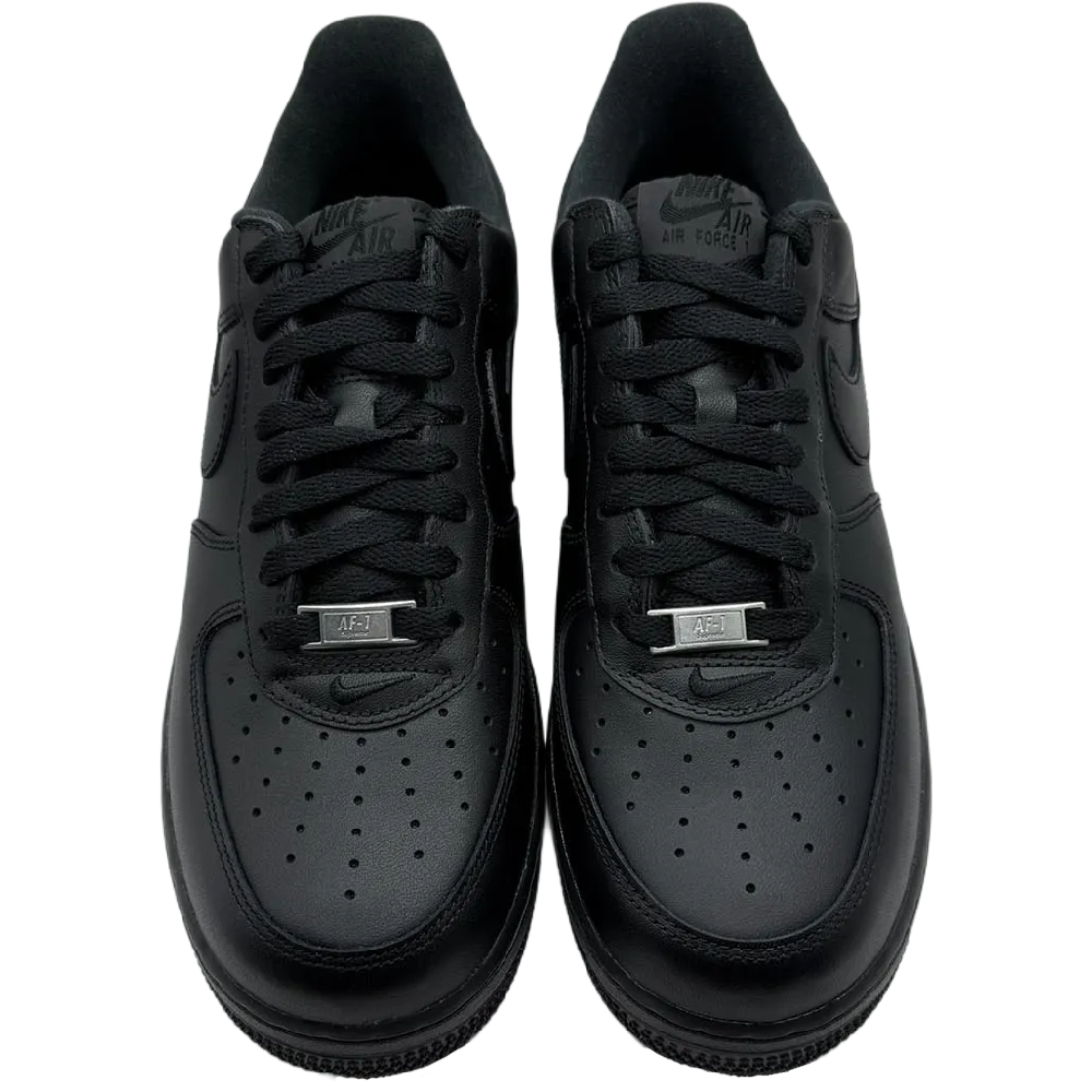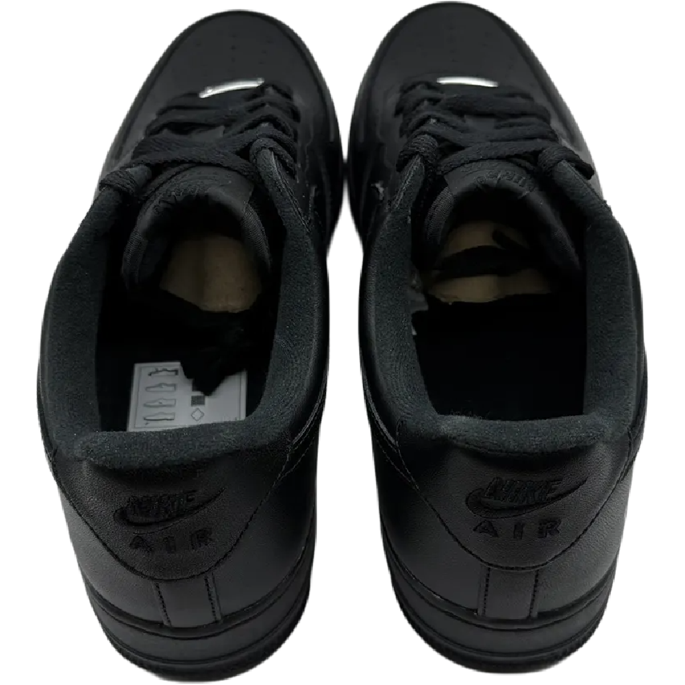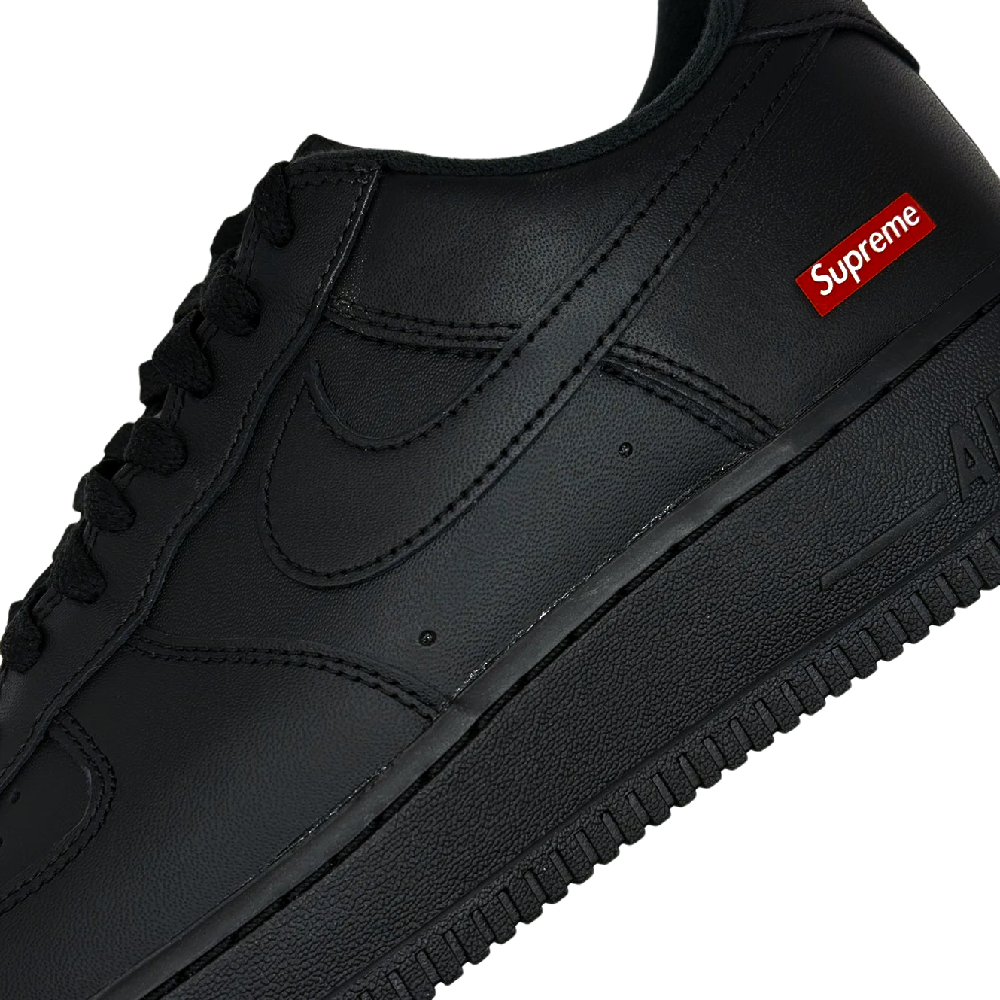 The upper of this Air Force 1 Low is made entirely of black leather, and the soles and details match. The design is finished with a crimson Supreme Box Logo put on the outside heel.