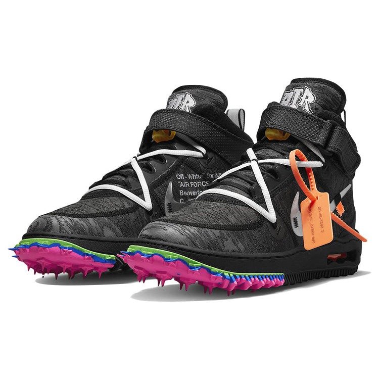 The Nike Air Force 1 Mid Off-White honors the 40th Anniversary of the Nike Air Force 1 by refreshing the classic design with Abloh’s signature avante-garde style. It arrives with a black, wood grain-textured lightweight mesh upper with ripstop collar straps and clear TPU Swooshes. From there, a warped midsole with multi-colored sections of a track-inspired spiked outsole reference past Nike Off-White designs like the Nike Waffle Racer and Air Zoom Tempo Next%.The Nike Air Force 1 Mid Off-White Black released in June of 2022 and retailed for $185.