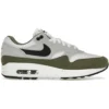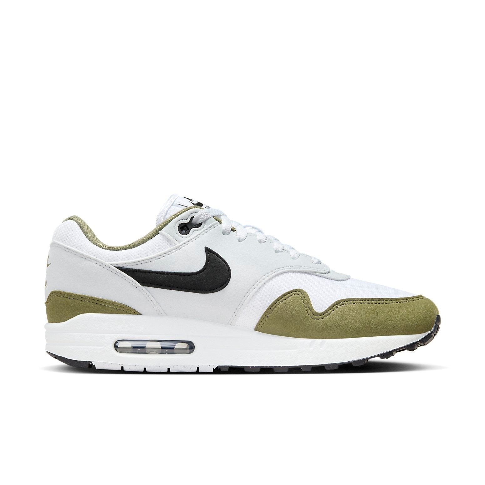 The Nike Air Max 1 White Black Medium Olive pays homage to the original Air Max 1, introduced in 1987, but with a modern twist in a color combination of white, black, Pure Platinum, and Medium Olive.The upper of the White Black Medium Olive Nike Air Max 1 is predominantly crafted from Crisp White mesh, accentuated by Pure Platinum overlays and a black Swoosh logo. Synthetic suede overlays in Pure Platinum adorn the white mesh base. Touches of olive green can be observed in the textile lining and synthetic suede mudguard, in addition to the stitched Nike Air logo located on the rear heel. The white PU midsole contains a visible Air-sole unit in the heel, guaranteeing a comfy stride. Additionally, the shoe features a two-toned black and white rubber outsole.The standout element of the Nike Air Max 1 White Black Medium Olive is the exposed Air-sole unit in the heel, providing enduring comfort and making the shoe an excellent choice for both athletic activities and casual wear. The sneaker debuted for $140 on October 12th, 2023.
