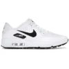 The Nike Air Max 90 Golf White Black is a variation of the Nike Air Max 90 Golf shoe.The White Black Nike Air Max 90 Golf features a white leather upper with black accents on the Nike Swoosh and sole. The sole of the shoe is made from a durable rubber material that provides excellent traction on different surfaces, including grassy golf courses. The sole also features a visible Air Max unit that provides enhanced cushioning for every step. The shoe also features a padded tongue and collar for added comfort and support around the ankle.We think that the notable feature of the Nike Air Max 90 Golf White Black is the shoe’s incorporation of both style and functionality. This golf shoe features the iconic Nike Air Max 90 silhouette, combined with features specifically designed for golfing. These features include a waterproof upper, a spikeless outsole for versatile traction, and a foam midsole that provides comfort and a more responsive feel during swings. The Nike Air Max 90 Golf White Black was released on December 22, 2020 at a retail price of $130.