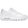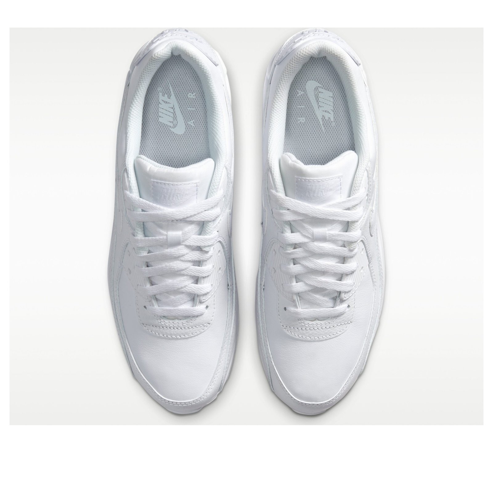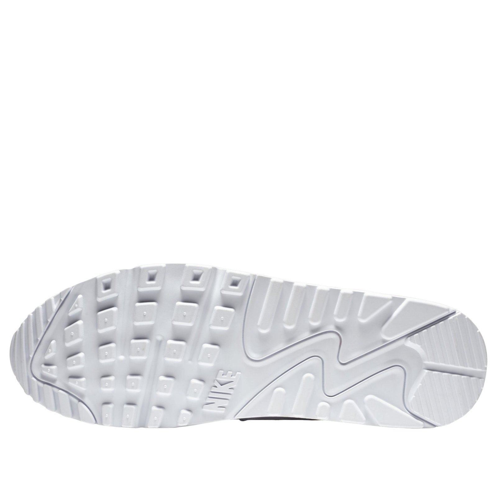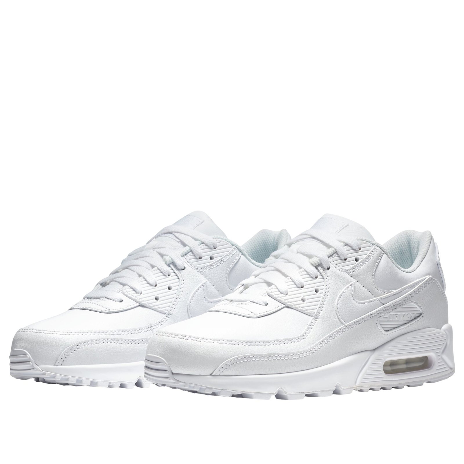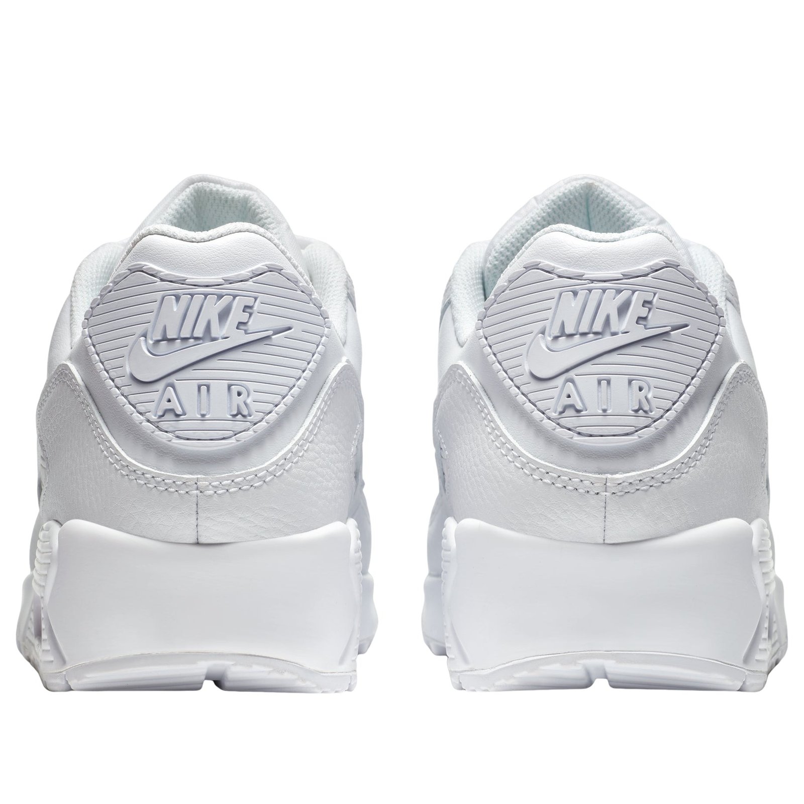 The Nike Air Max 90 Leather Triple White 2020 takes on a 1990 original design, and is covered in an all-white finish. The sneaker is constructed of white TPU eyelets, a mesh upper with stitched leather overlays, a waffle-tread rubber outsole for traction and an Air-infused midsole for cushioning. Further, it displays Air Max units on both medial sides with a padded tongue panel printed with a Nike Swoosh emblem. Additionally, this Air Max Triple version has printed Nike branding on its heel. The Nike Air Max 90 Leather Triple White 2020 debuted on July 28th, 2020, and retailed at $130.