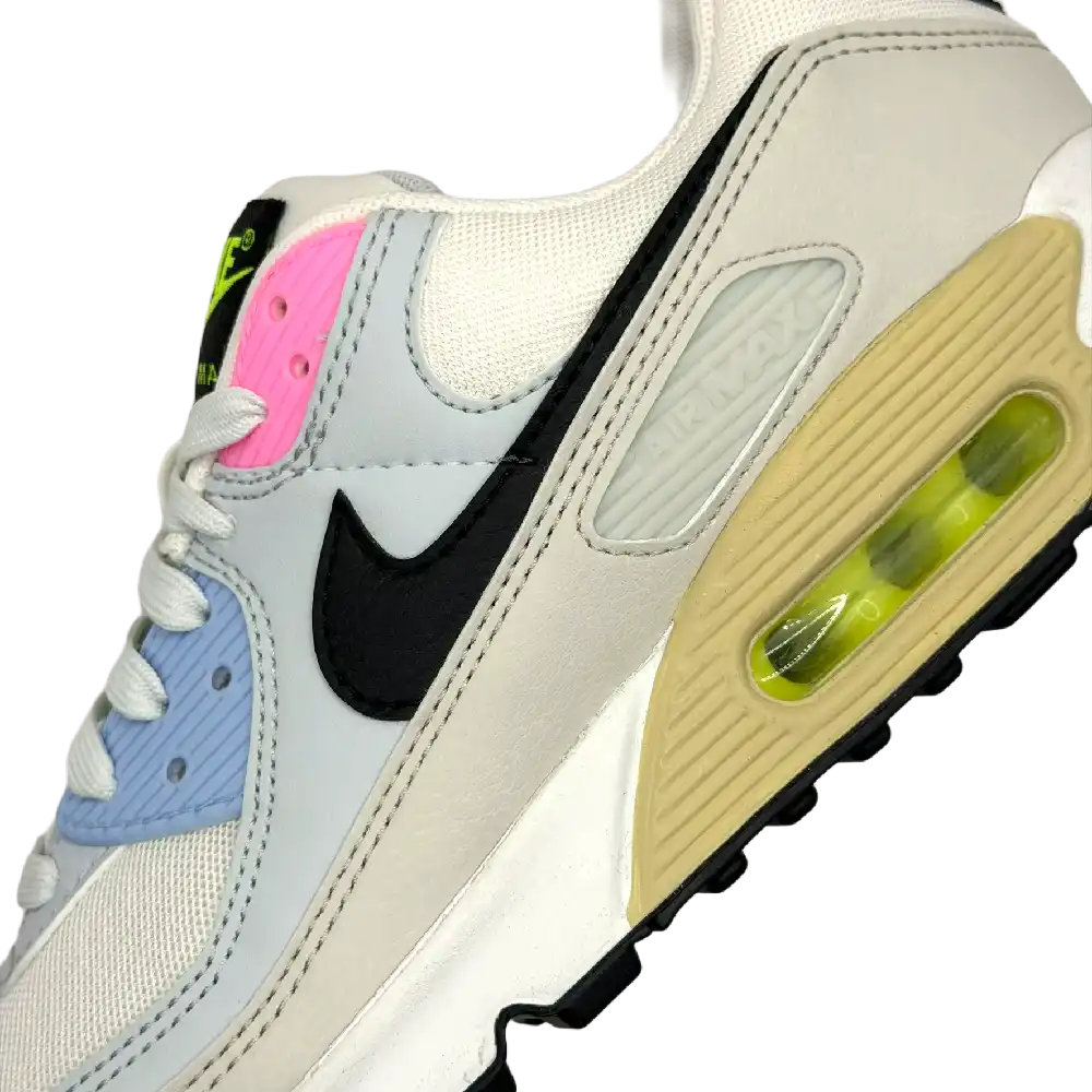 The Nike Air Max 90 Multi-Color Pastel (Women’s) adds a Summit White base and multicolor accents to the classic Air Max 90 silhouette.Featuring a waffle sole and layered overlays, this version of the Nike Air Max 90 maintains its running shoe roots. In addition, visible Air Max cushioning contributes to the running aesthetic and protects against impact. The upper is made of Summit White leather with TPU details in pink, light blue, and tan, while the overlays come in Light Bone and Pure Platinum. The black leather Swoosh logos match the rubber outsole and the rubber tab on the heel.Our experts at Newsole like the neon-yellow branding on the woven tongue tag that complements the Air Max units seen through panels in the heel. The women s size Nike Air Max 90 Multi-Color Pastel (Women’s) was originally launched on December 28, 2022, and sold for $130.
