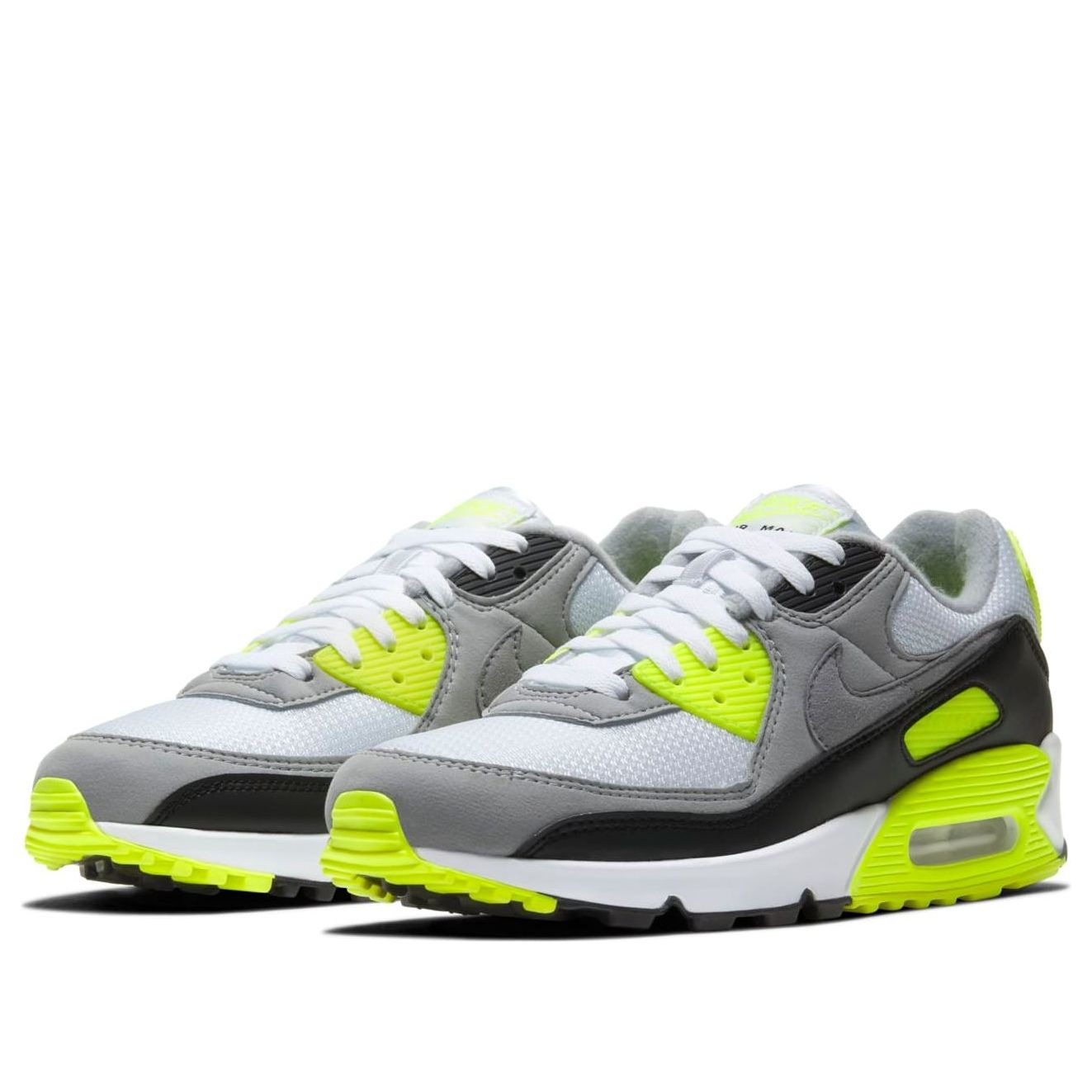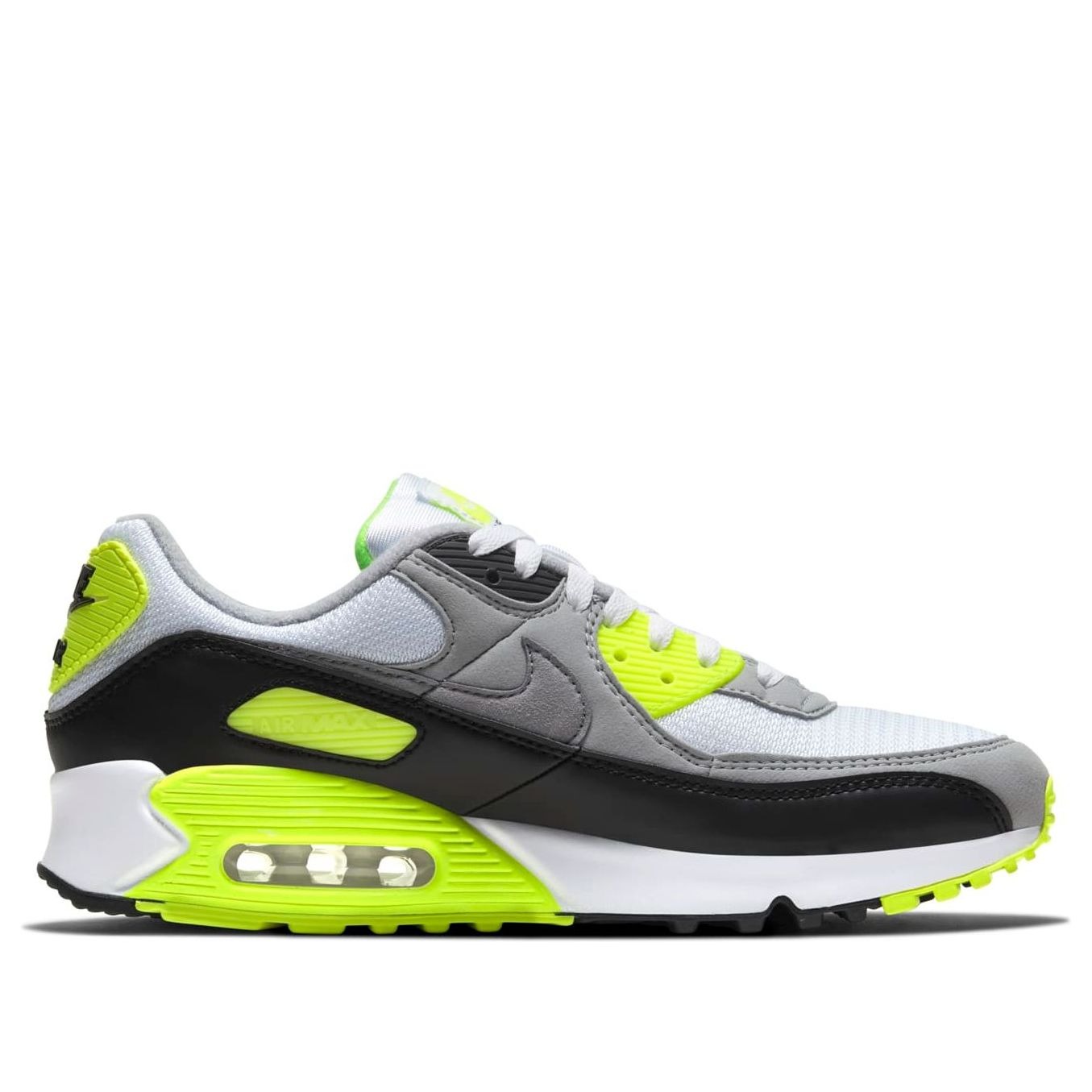 The Nike Air Max 90 OG White Particle Grey Volt has become a celebrated version in the catalog that marks the 30th anniversary of the 1990 OG edition sneaker.This OG Air Max 90 by Nike has an upper dressed in white mesh with gray suede overlays and a black leather mudguard. The shoe sits atop a foam midsole with visible Air sole cushioning. Energetic pops of Volt deliver contrasting color at the eyestay, heel and also at the midsole wedge.The Nike Air Max 90 OG White Particle Grey Volt was first released on the 9th of January 2020, and initially retailed for $120.