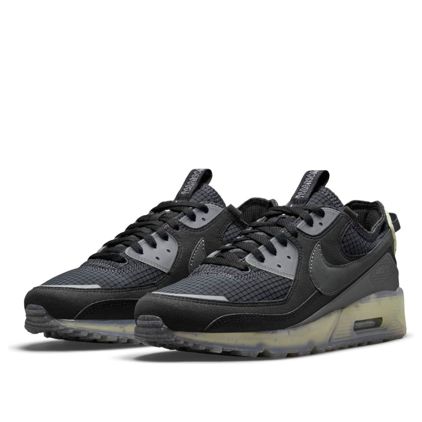 The Nike Air Max 90 Terrascape Black Lime Ice has a unique sole that features cloudy plastic. The upper part of the shoe is primarily black and made out of different types of material and fabrics, such as mesh, which is included for its breathability. Black laces are sandwiched between two panels of transparent plastic.Initially released in October of 2021, the Nike Air Max 90 Terrascape Black Lime Ice had a starting retail price of $140 in men s sizes.