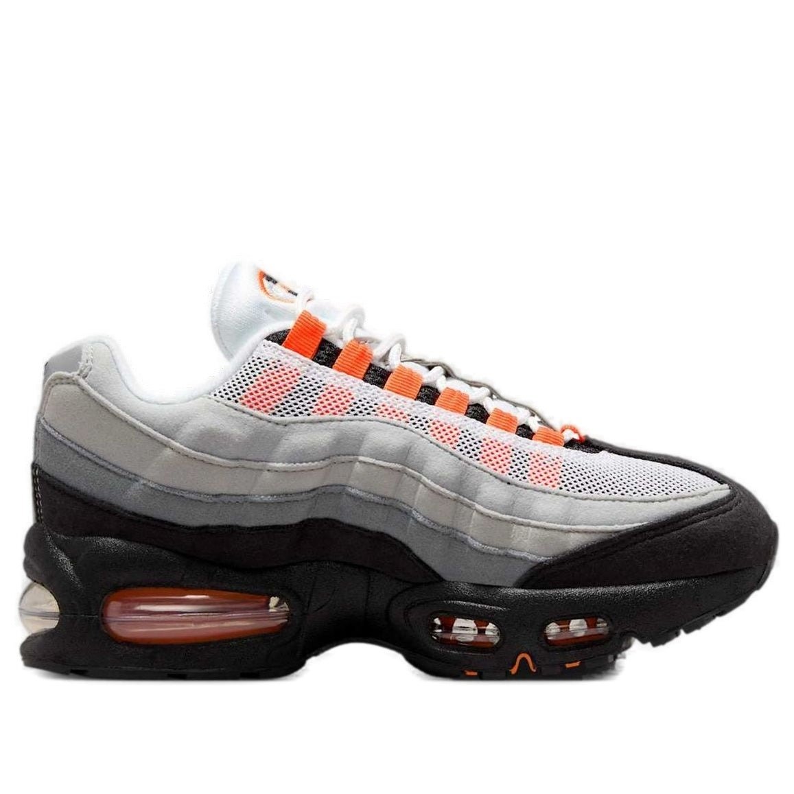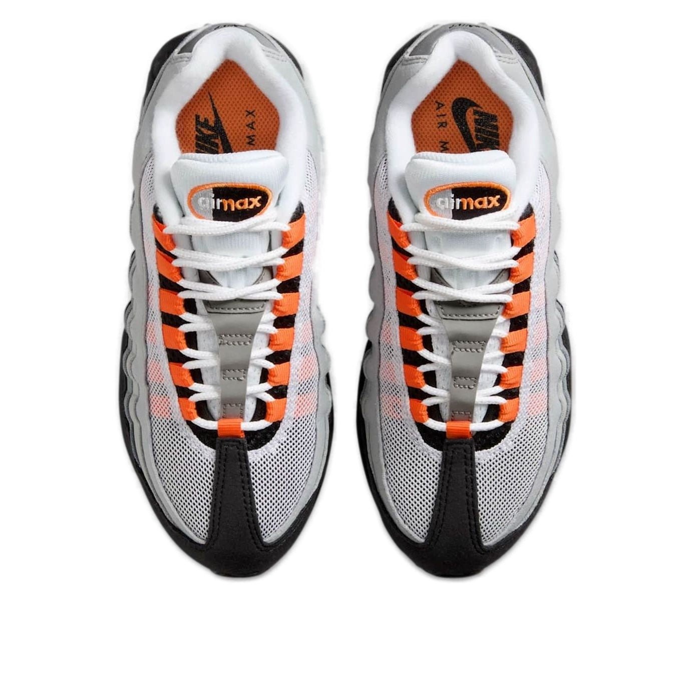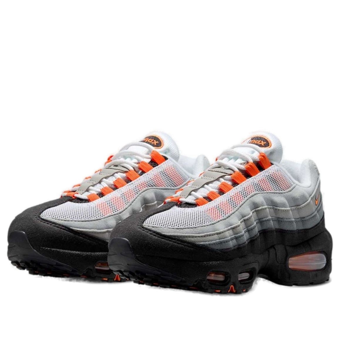 The Nike Air Max 95 OG Bright Mandarin (2025) (GS) features a White/Bright Mandarin/Wolf Grey/Light Smoke Grey/Black colorway. This Nike Air Max 95 OG was first released for $145 on June 06, 2025.
