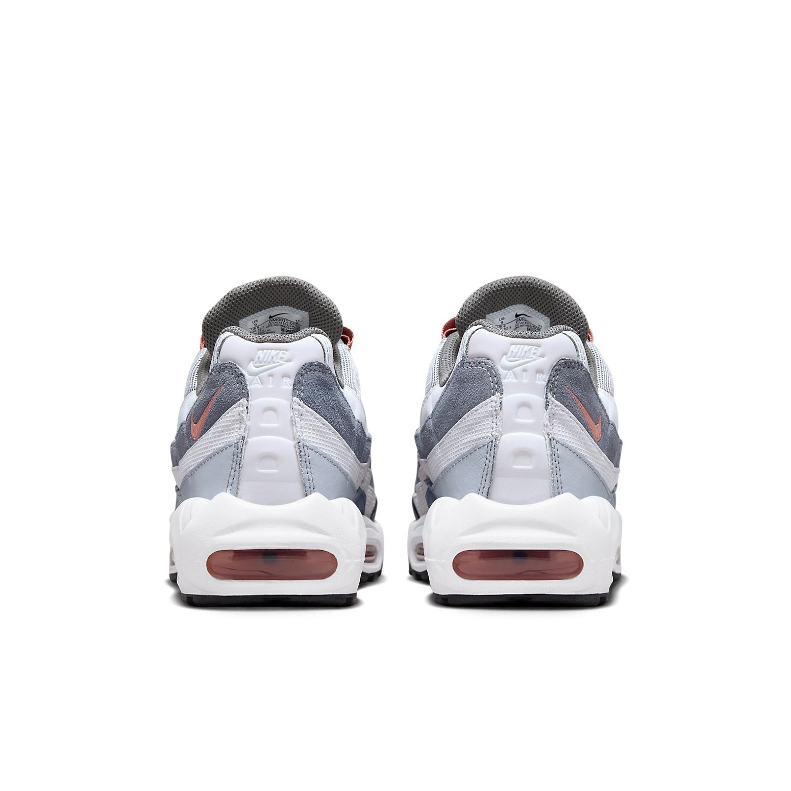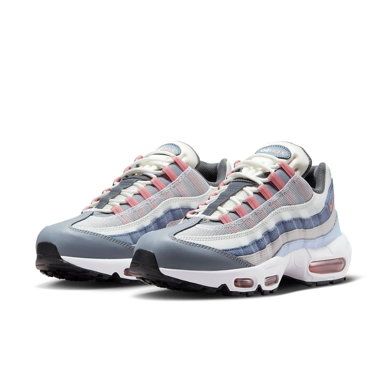 The Nike Air Max 95 Vast Grey Red Stardust is a performance sneaker featuring visible Air Max units not only in the heel but also under the forefoot.This version of the Nike Air Max 95 is made with a textile, leather, and suede upper. The upper features a streamlined layered design, with a layer of white mesh covering the gray base under the laces, then a layer of white leather, then a layer of dark gray suede, and finally a layer of lighter gray suede on the bottom. These layers run from the dark gray toe cap all the way to the heel. A pink Nike swoosh can be found on the lateral side of the heel, while the tongue features Air Max branding. The heel counter features another subtle Nike logo. The chunky white rubber outsole features transparent Air Max units both under the heel and under the forefoot in a pink color. What we like best about this shoe is the unique layered design that is void of branding on the sides. The Nike Air Max 95 Vast Grey Red Stardust was released in 2023 for a retail price of $175.