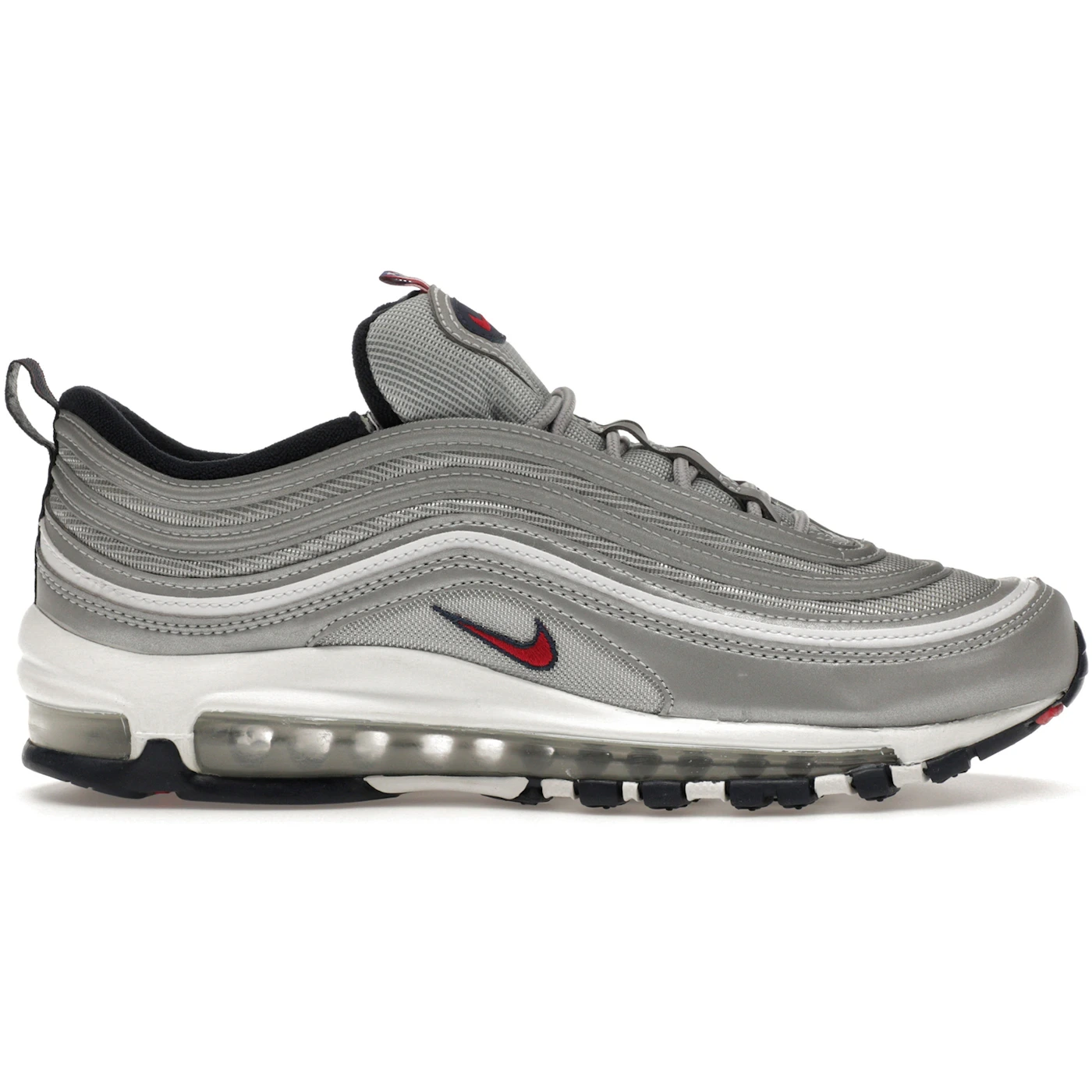 The Nike Air Max 97 Puerto Rico features a silver mesh and reflective upper with a red and navy embroidered Swoosh on the lateral side. Puerto Rican flags on the tongue loops and outsoles complete the design.The Nike Air Max 97 Puerto Rico released in June of 2021 and retailed for $175.